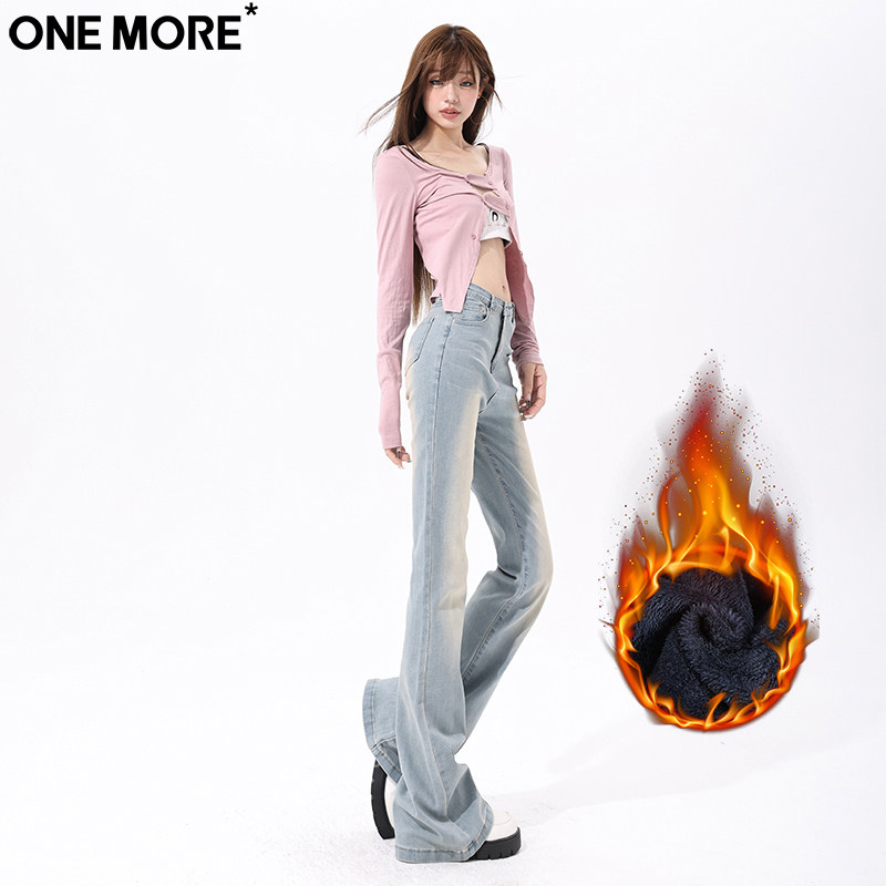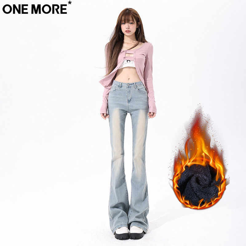 One More辣妹低腰微喇加绒牛仔裤女冬季新款弹力修身显瘦喇叭裤子