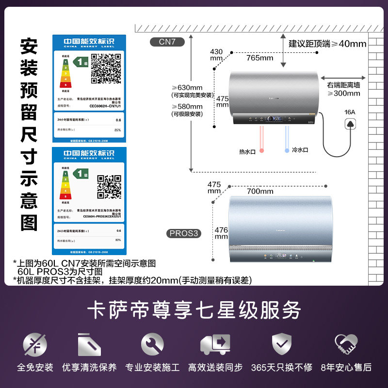 [国补20%]卡萨帝电热水器60/80升洗澡家用圆桶CN7变频节能无镁棒