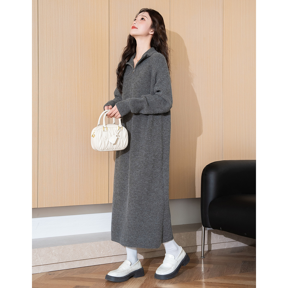 唐狮连衣裙女秋季高级感气质女翻领拉链宽松简约长袖连衣裙子tuTA