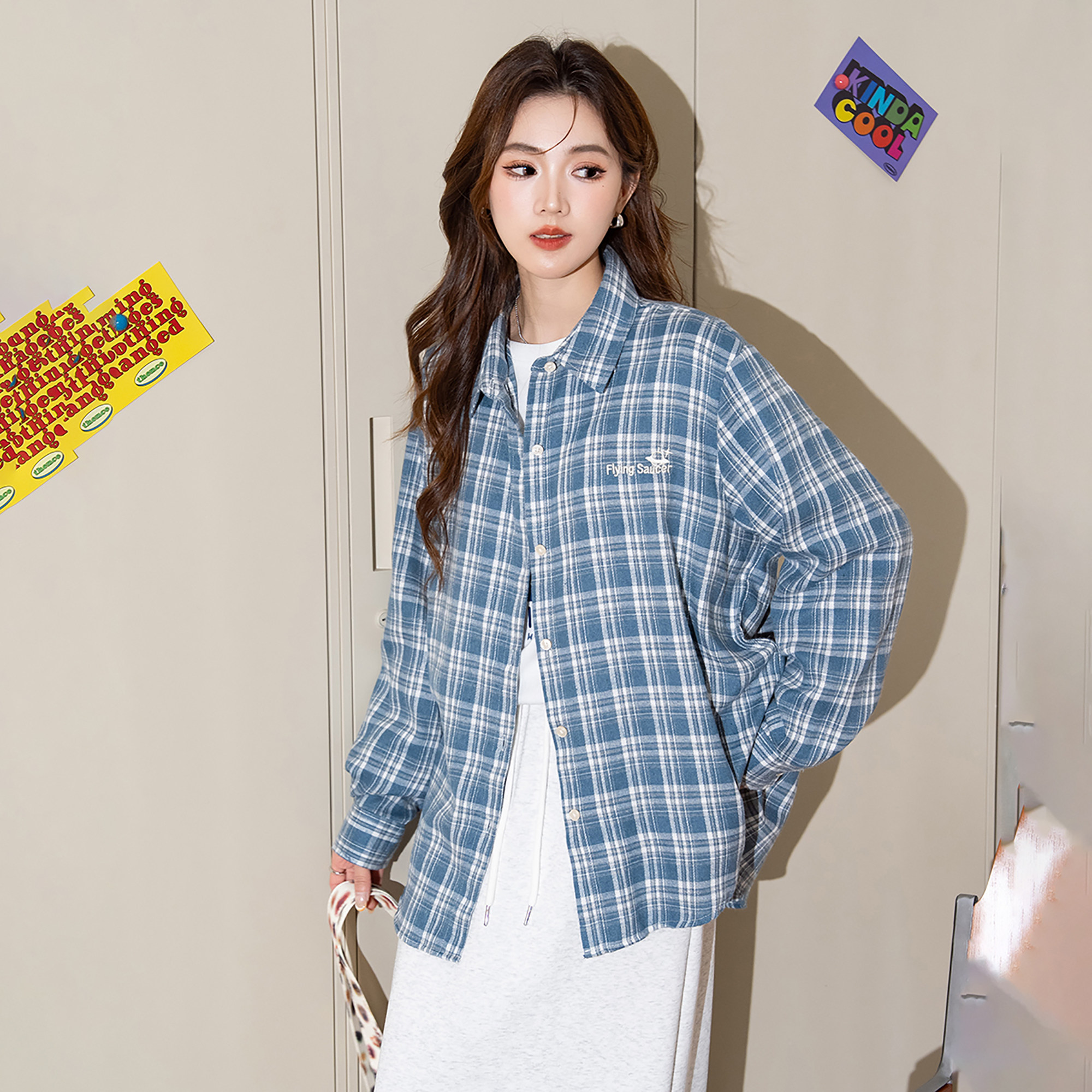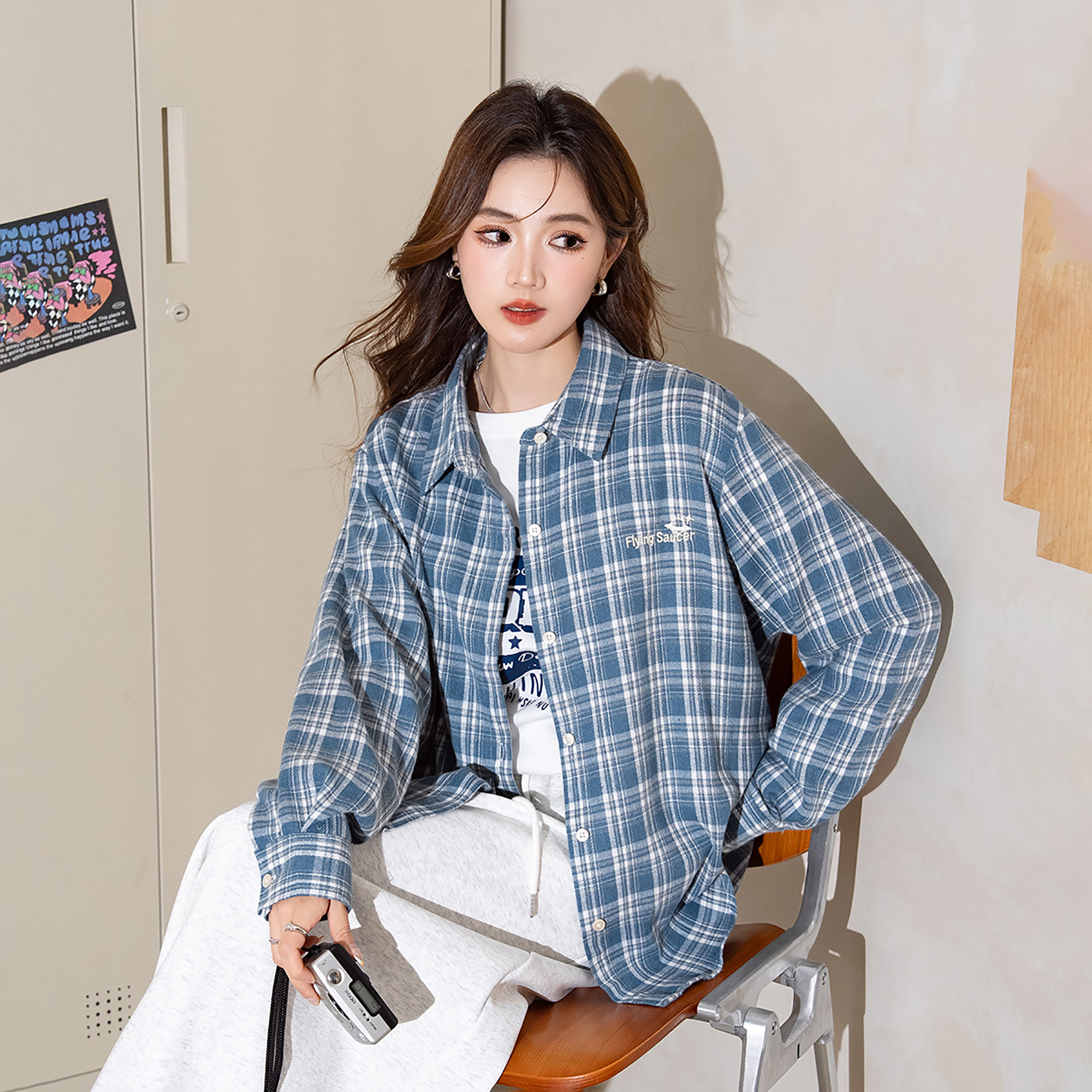 唐狮新款女长袖格子衬衫外套港风翻领宽松前胸刺绣上衣blTM