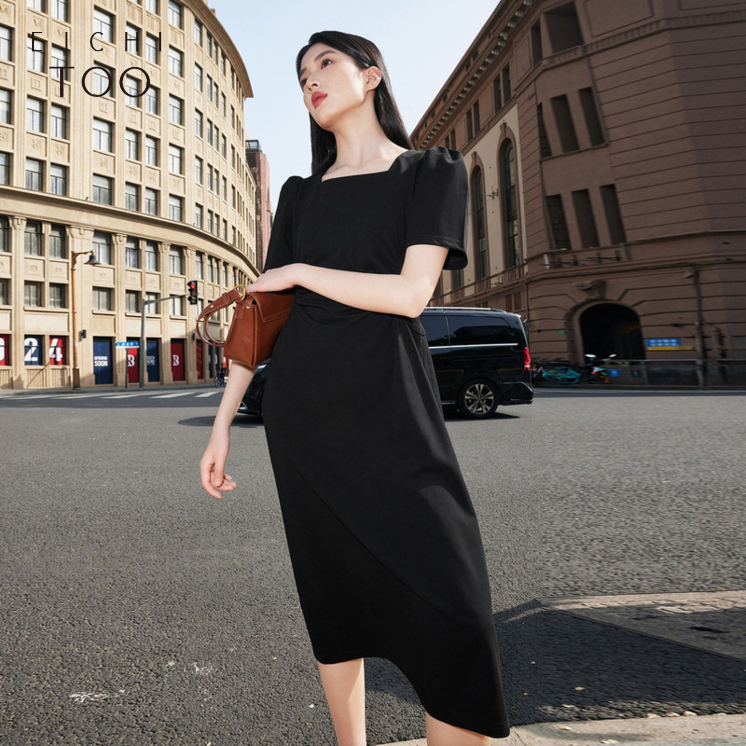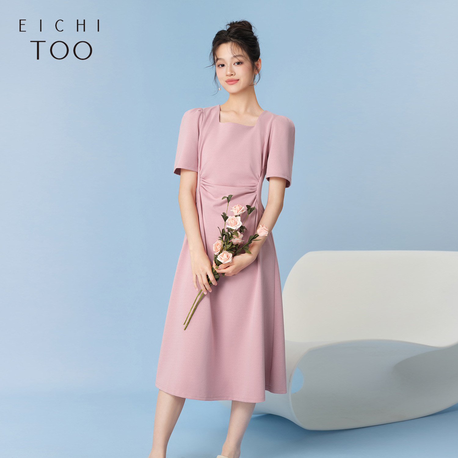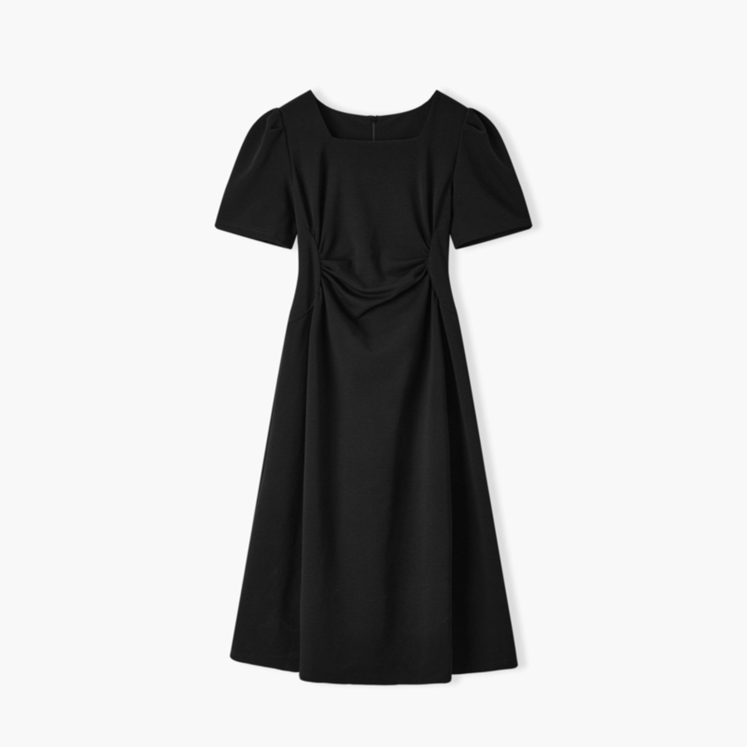 【热销补货】欧时力 褶皱短袖连衣裙女2026春新款收腰显瘦小黑裙