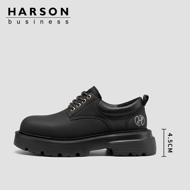 哈森皮鞋男款高级感真皮大头皮鞋休闲黑色增高工装鞋厚底德比鞋男