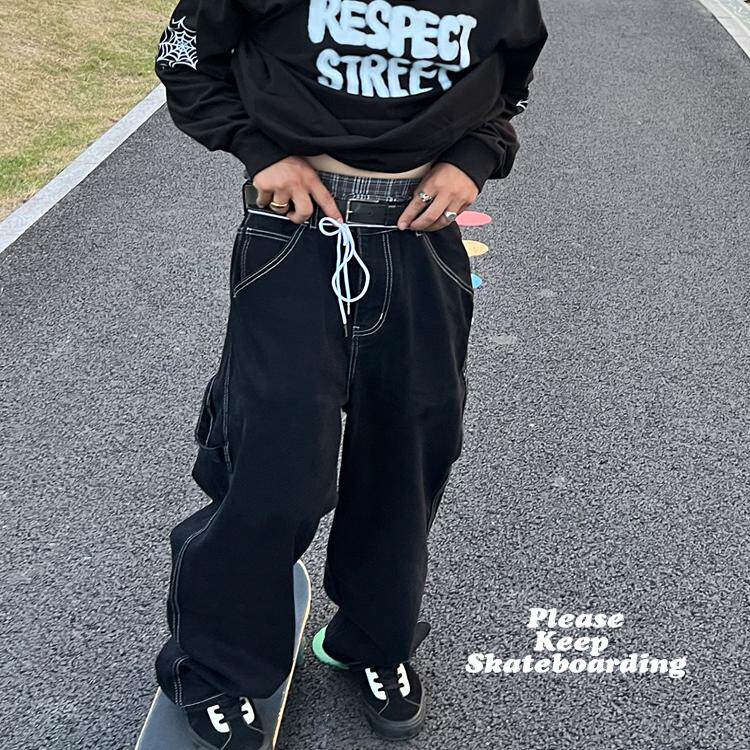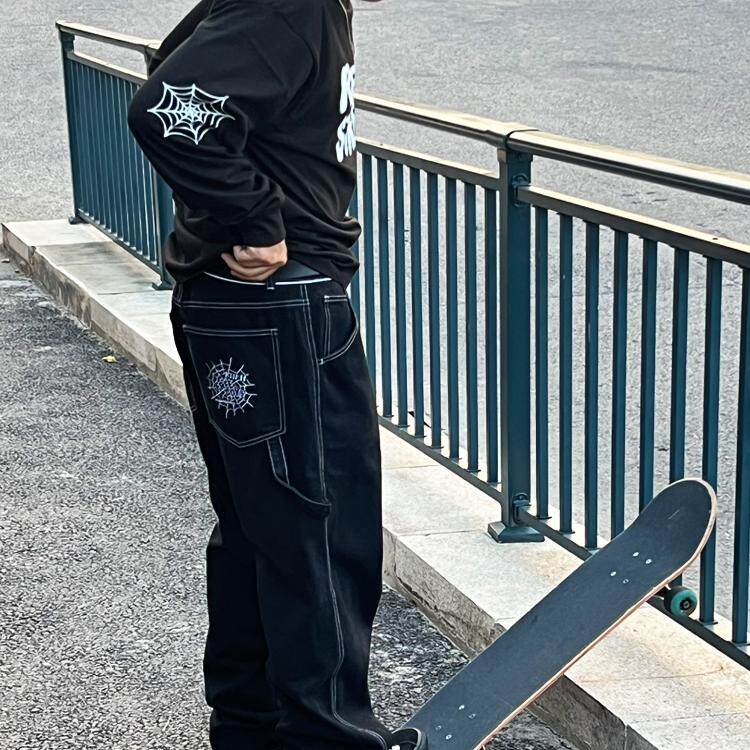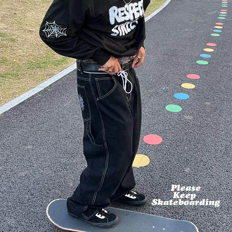 滑板直筒阔腿水洗牛仔裤街舞蜘蛛网刺绣黑工装BigBoy阔腿牛仔长裤