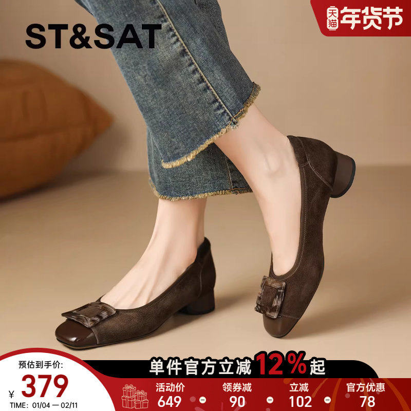 星期六棕色单鞋女2025方头浅口粗跟女鞋方扣气质通勤设计师工作鞋
