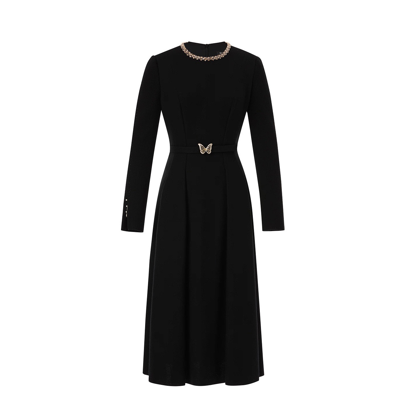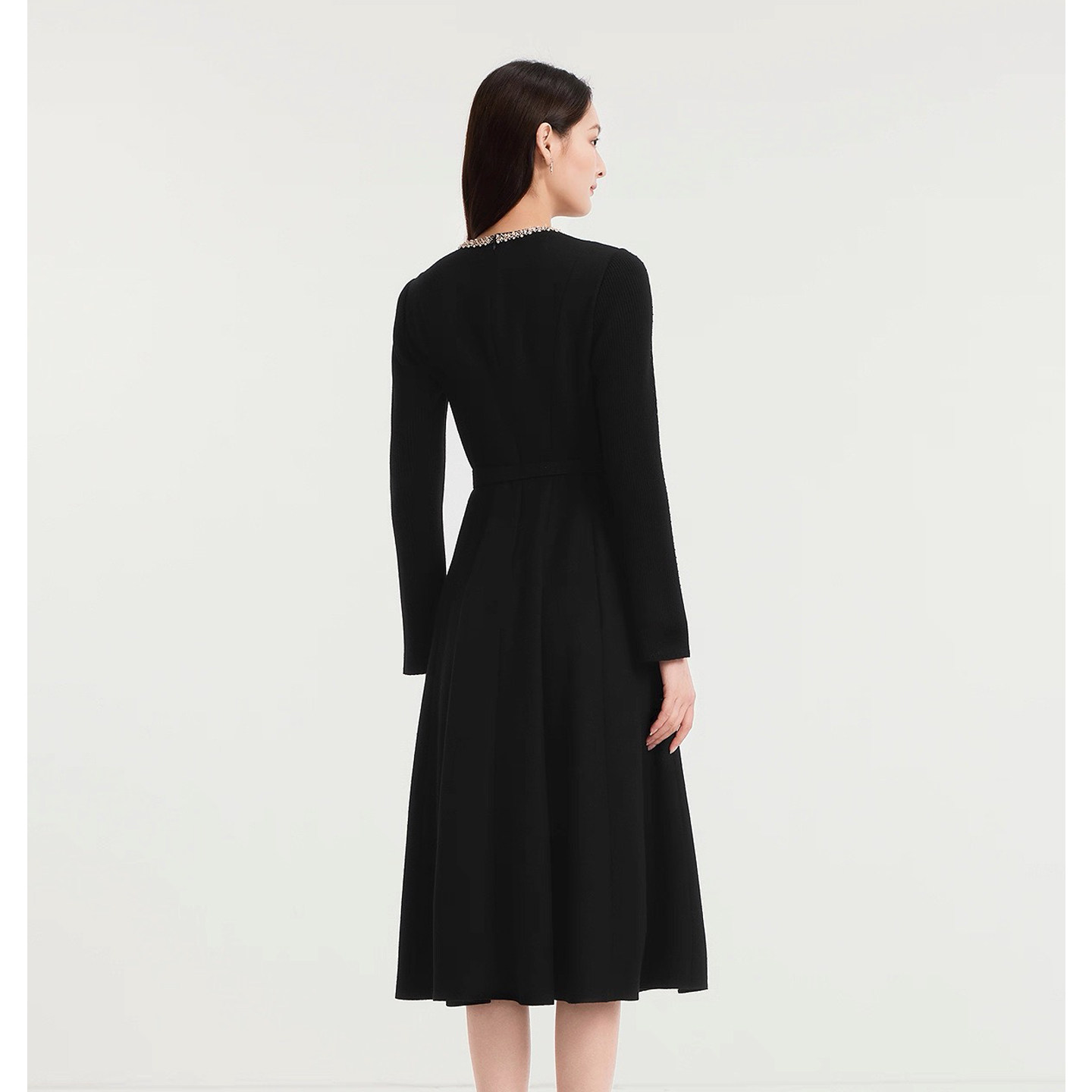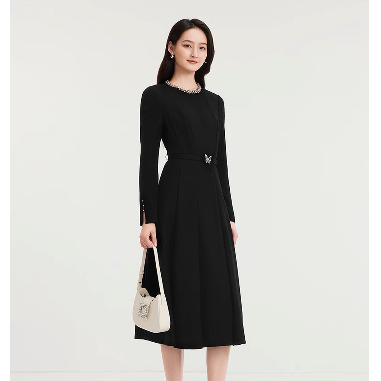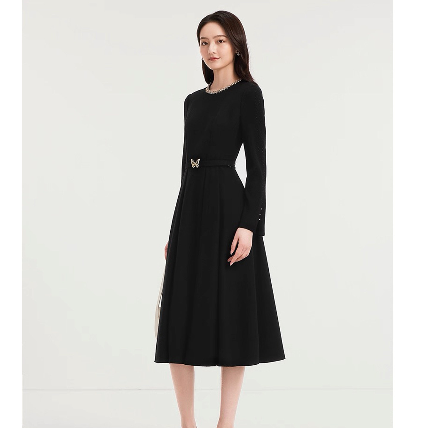 珂莱商场同款2025冬季新款女装黑色圆领收腰钉珠长袖羊毛呢连衣裙