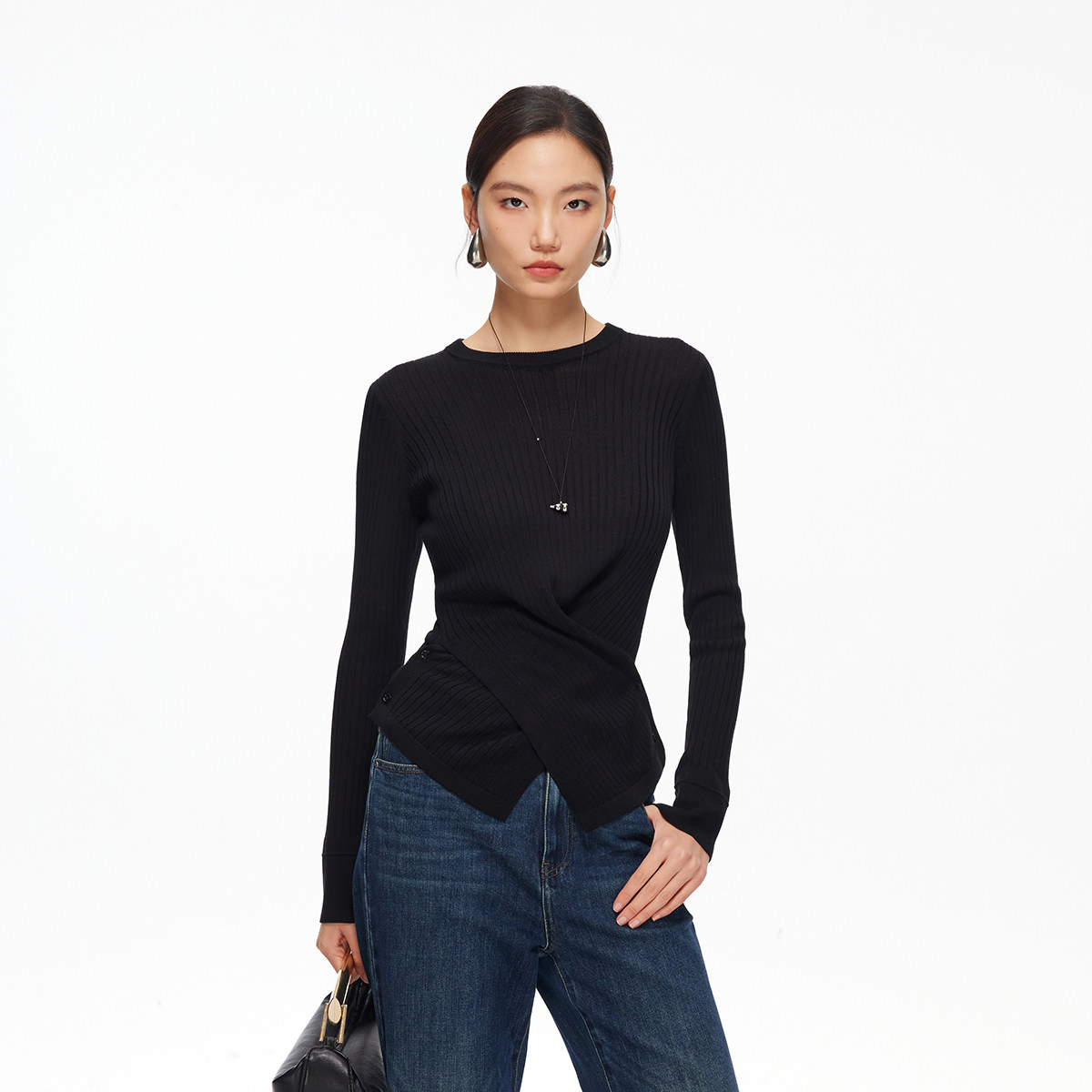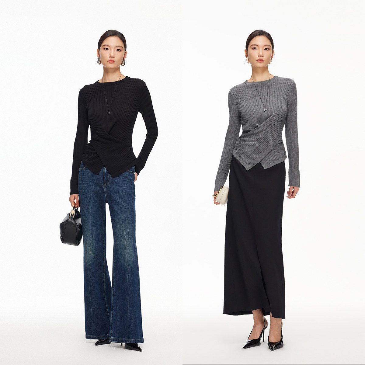 三福长袖上衣2025新款秋季圆领修身针织衫简约纯色内搭打底衫女装