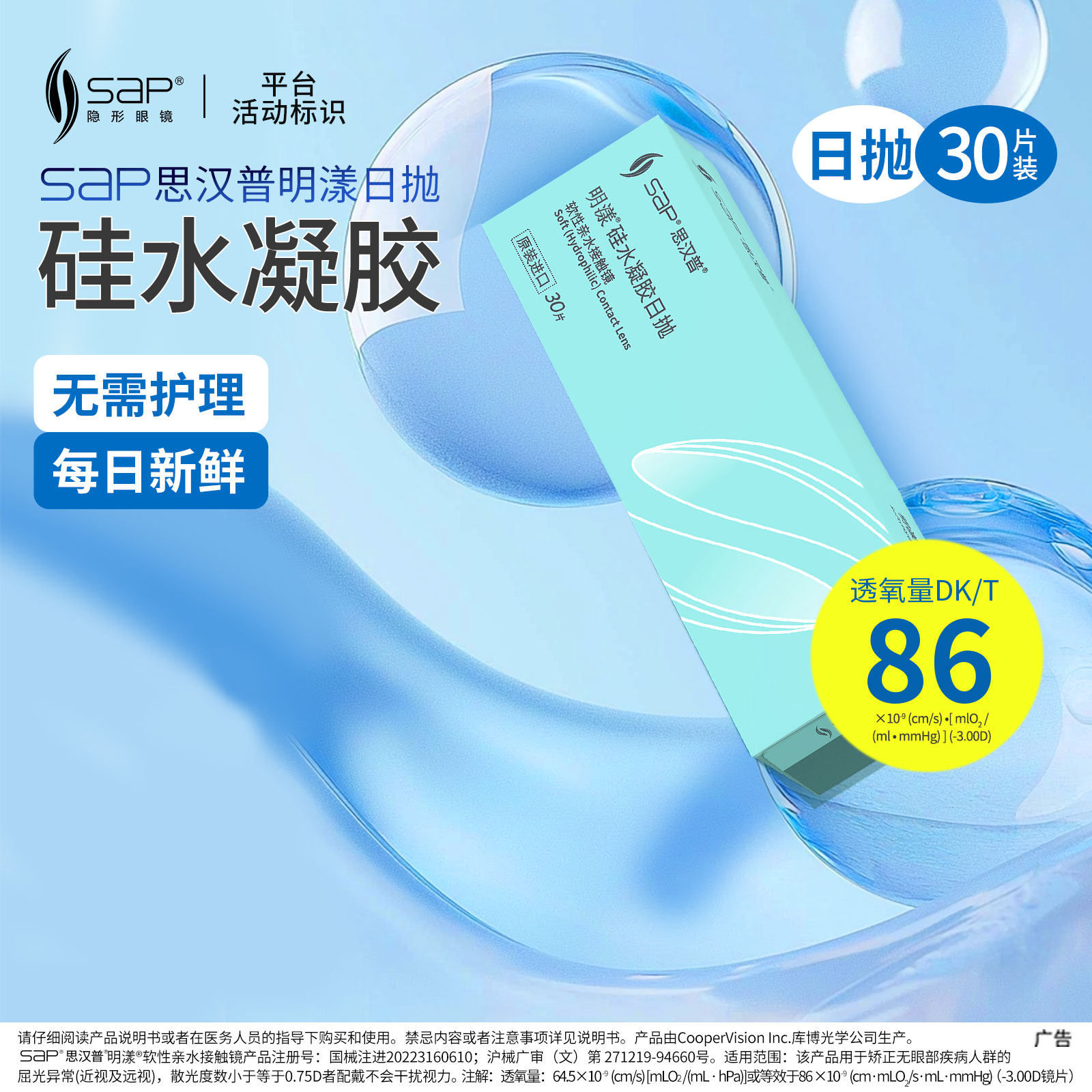 SAP思汉普明漾隐形眼镜日抛30片硅水凝胶高透氧近视透明非清氧清