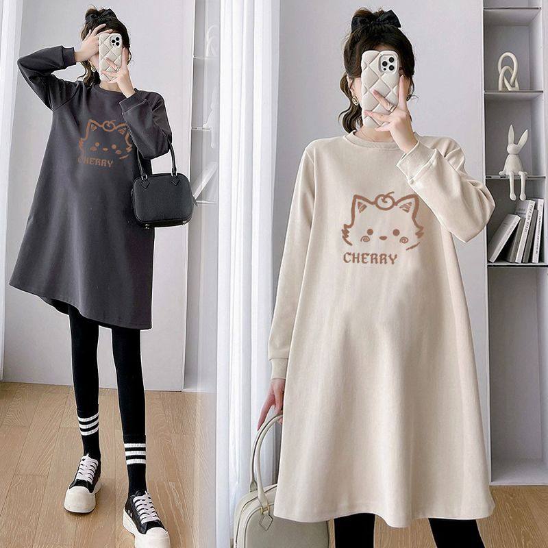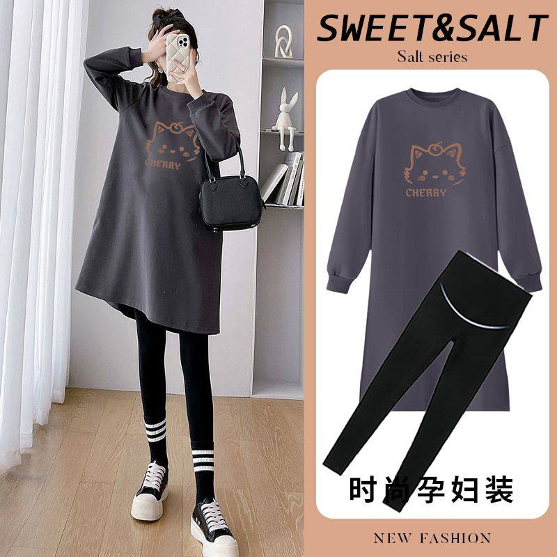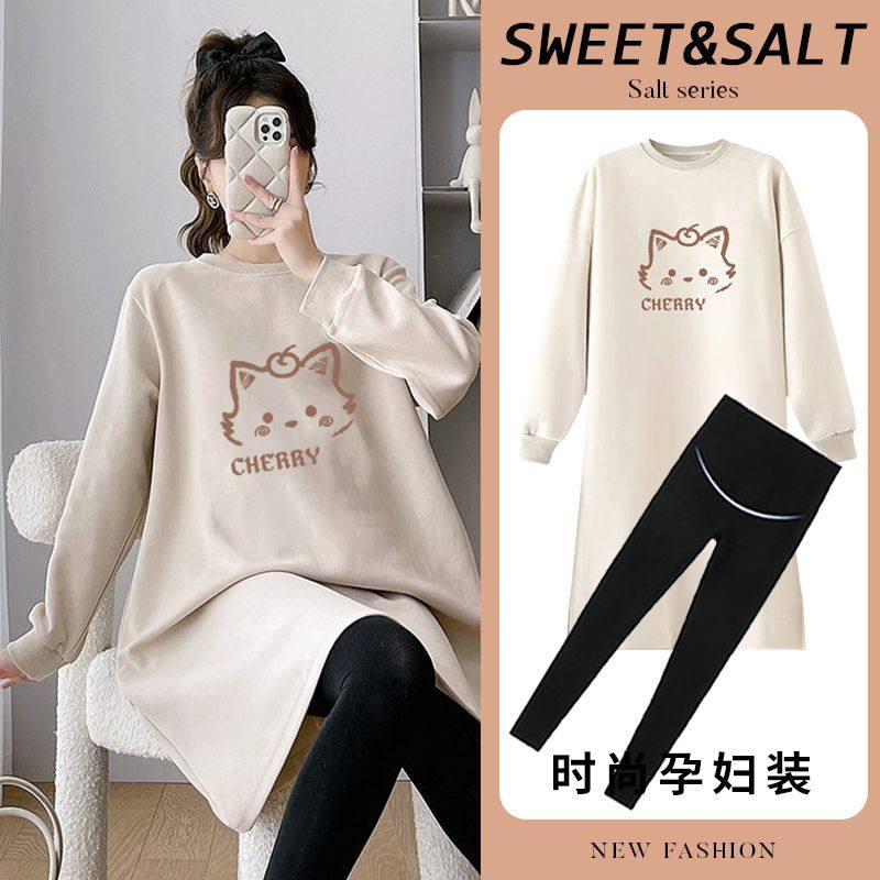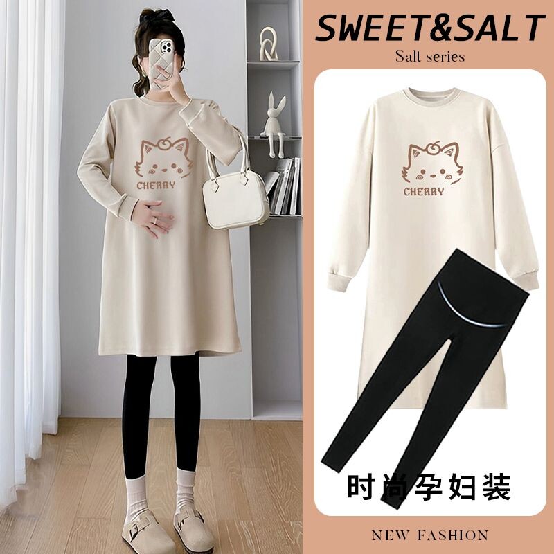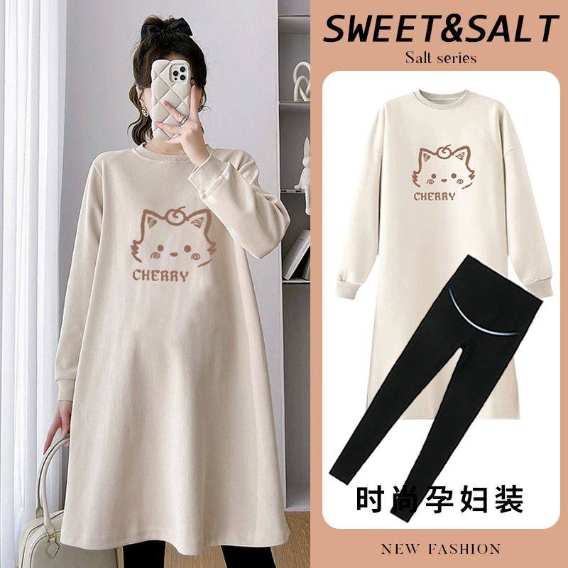 孕妇春秋韩版长袖纯棉连衣裙新款中长款宽松遮肚显瘦裙子两件套