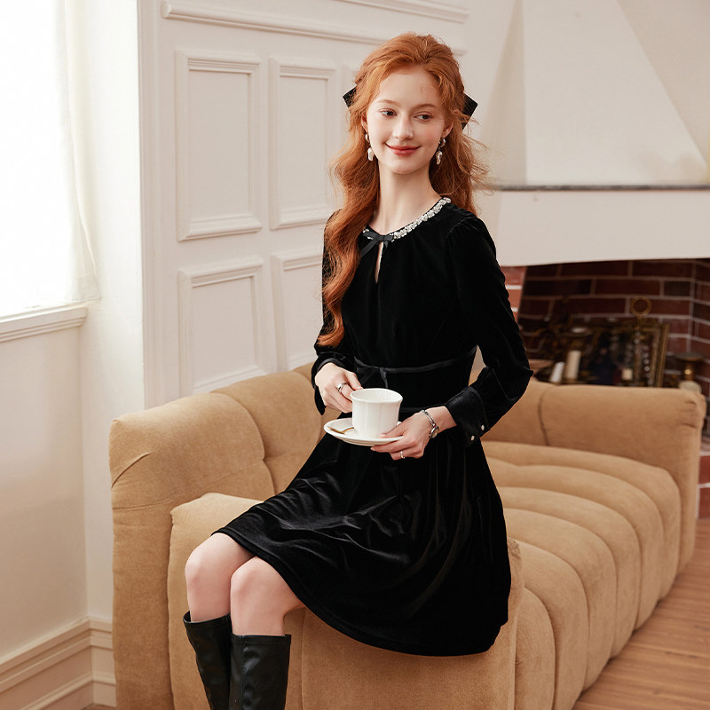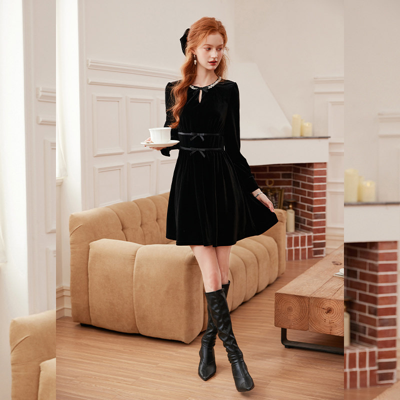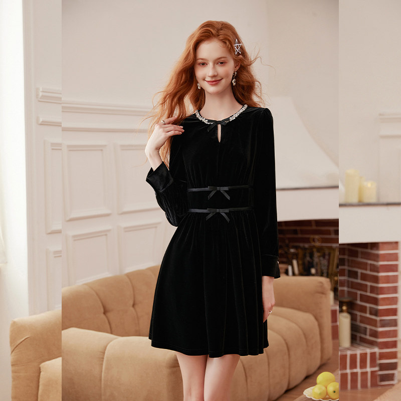 领口钉珠蝴蝶结设计 收腰显瘦丝绒小黑裙