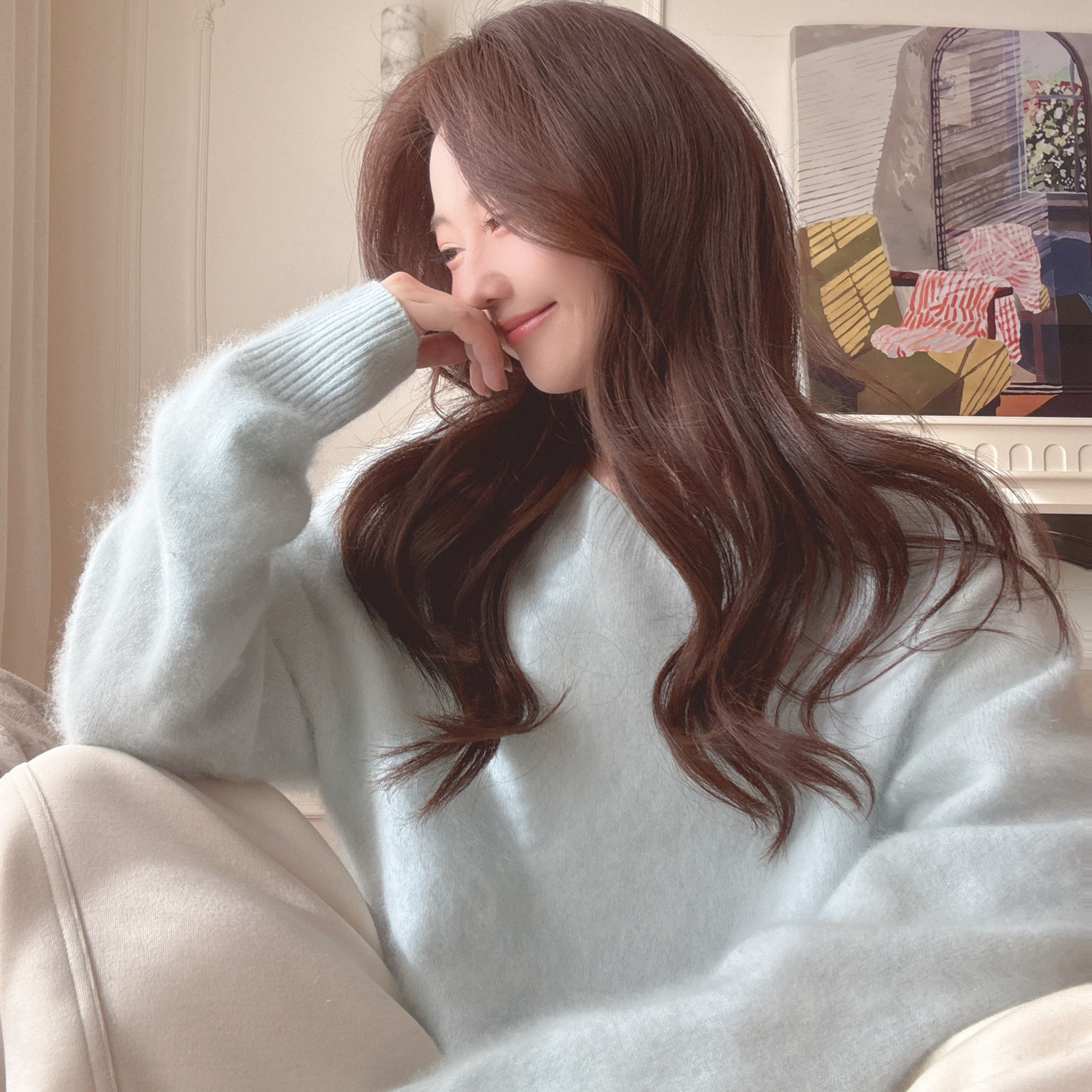 曹大曼 慵懒松弛感显白婴儿蓝色拉绒毛衣温柔贵气山羊绒拉毛毛衣