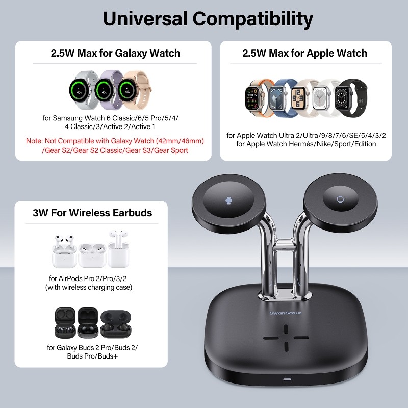 白鹄SwanScout704D 双手表无线充电器适用苹果apple watch系列iWatchS1-S11/SE三星Galaxy Watch8/7/6 Ultral
