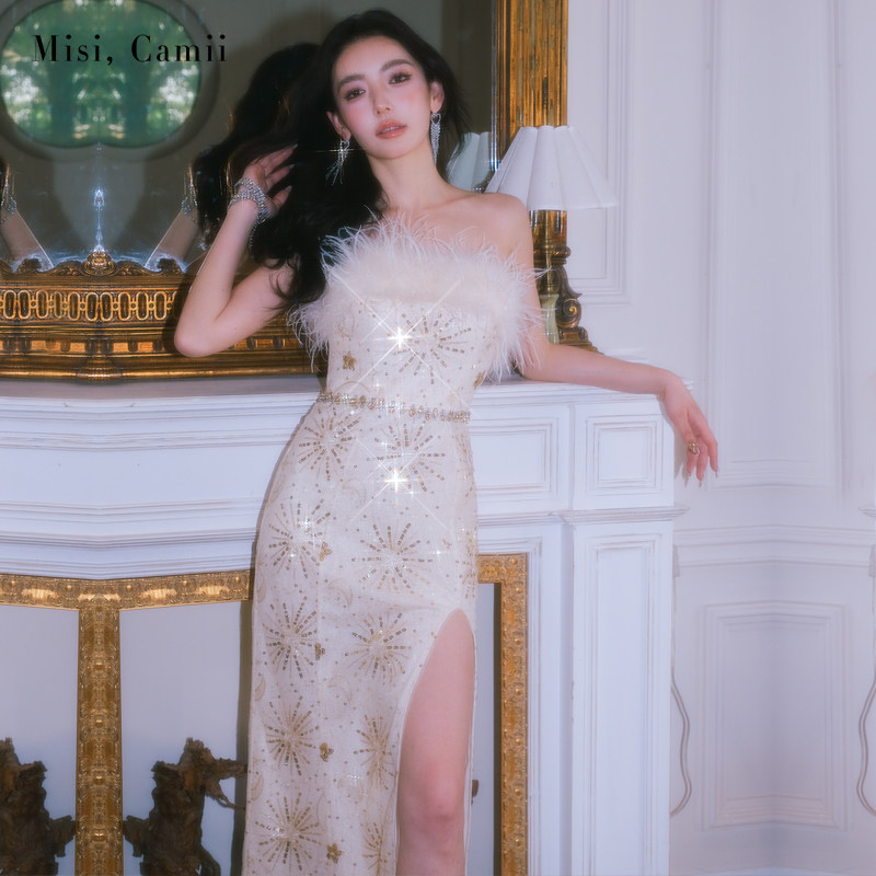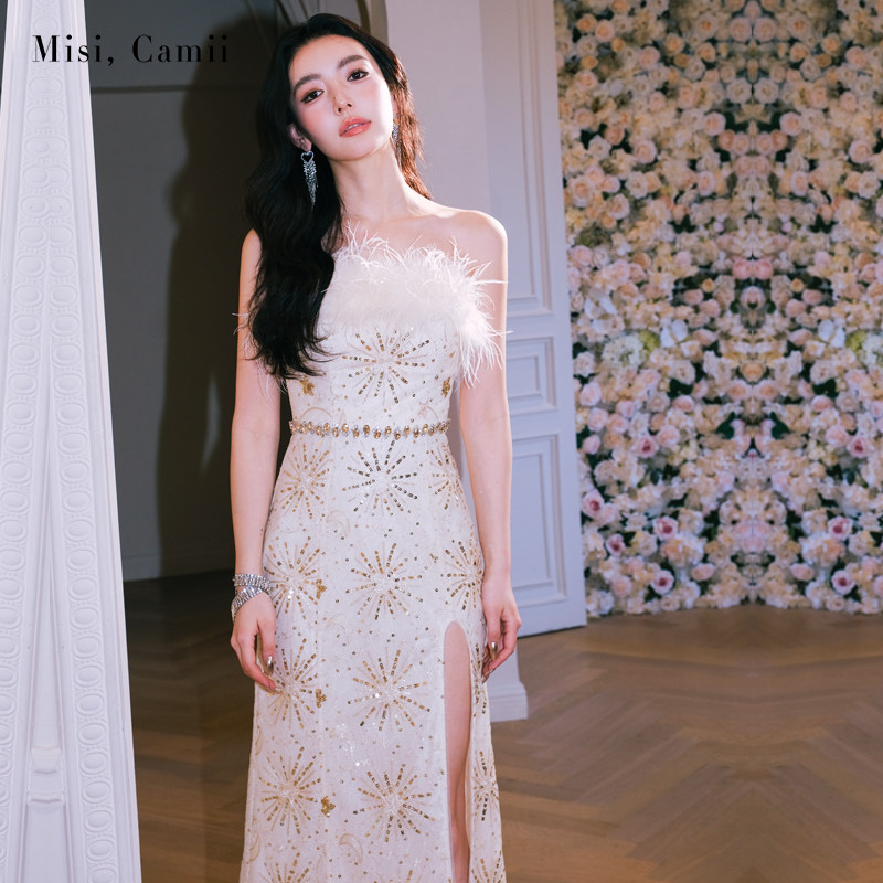 Misi.Camii2024春夏新款羽毛抹胸星月鱼尾礼服裙名媛时尚女连衣裙