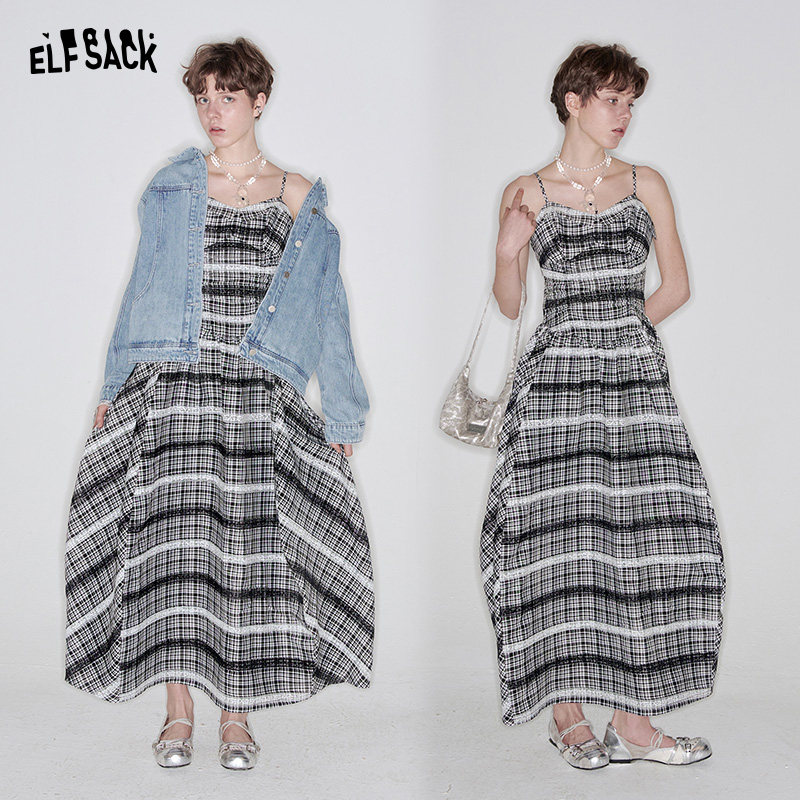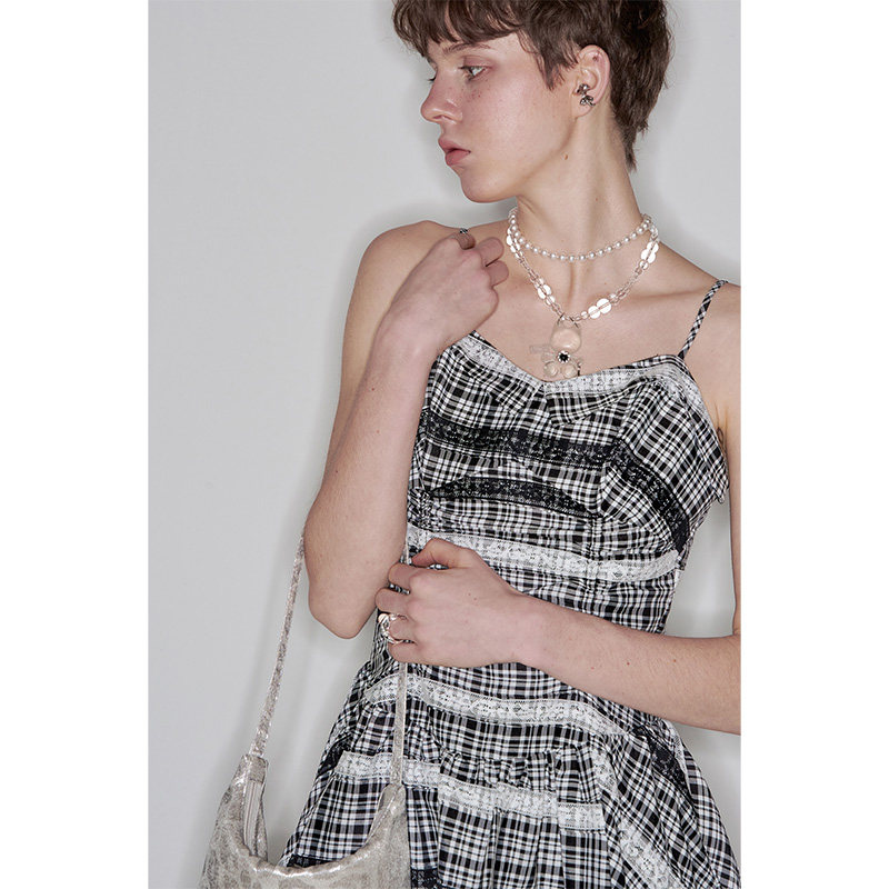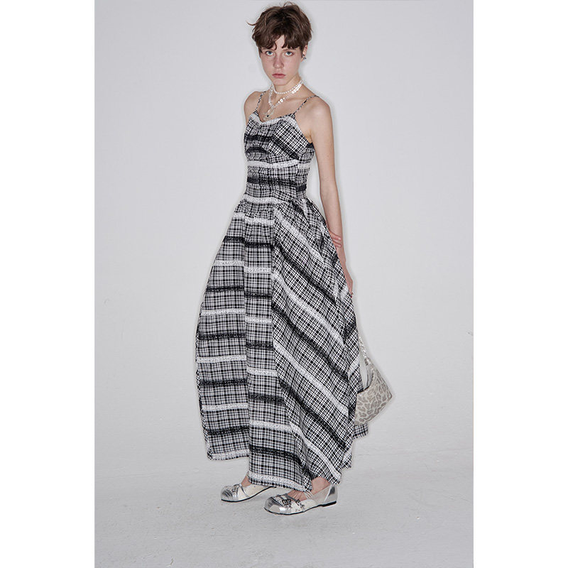 妖精的口袋蕾丝拼接条纹吊带连衣裙女2025年秋季新款收腰内搭裙子