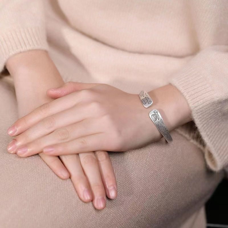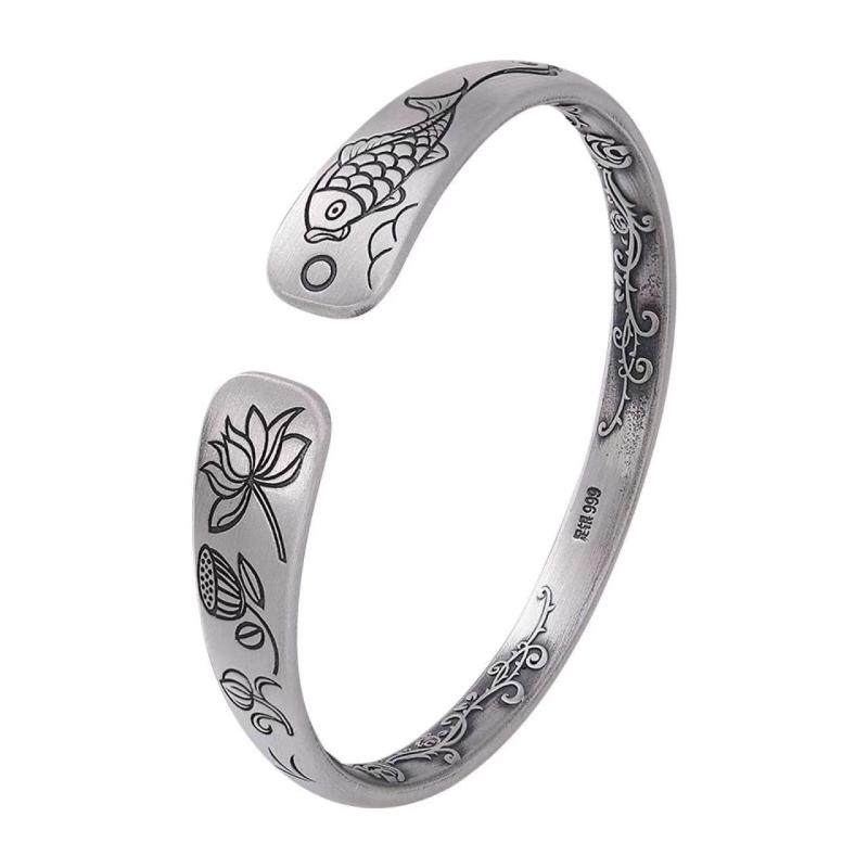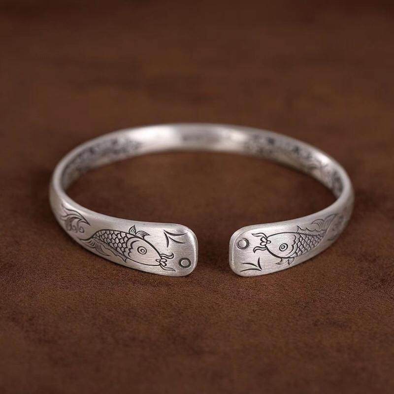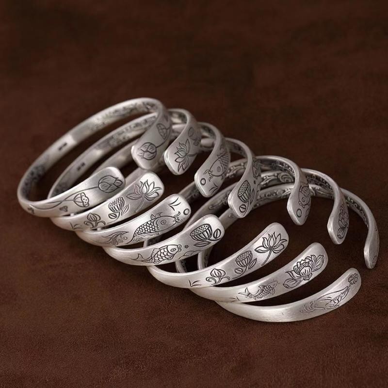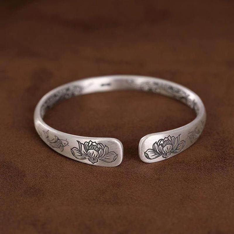镀999足银莲花鱼禅意手镯送妈妈老人开口纯银复古做旧佛系银镯子