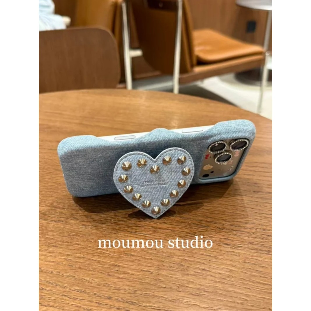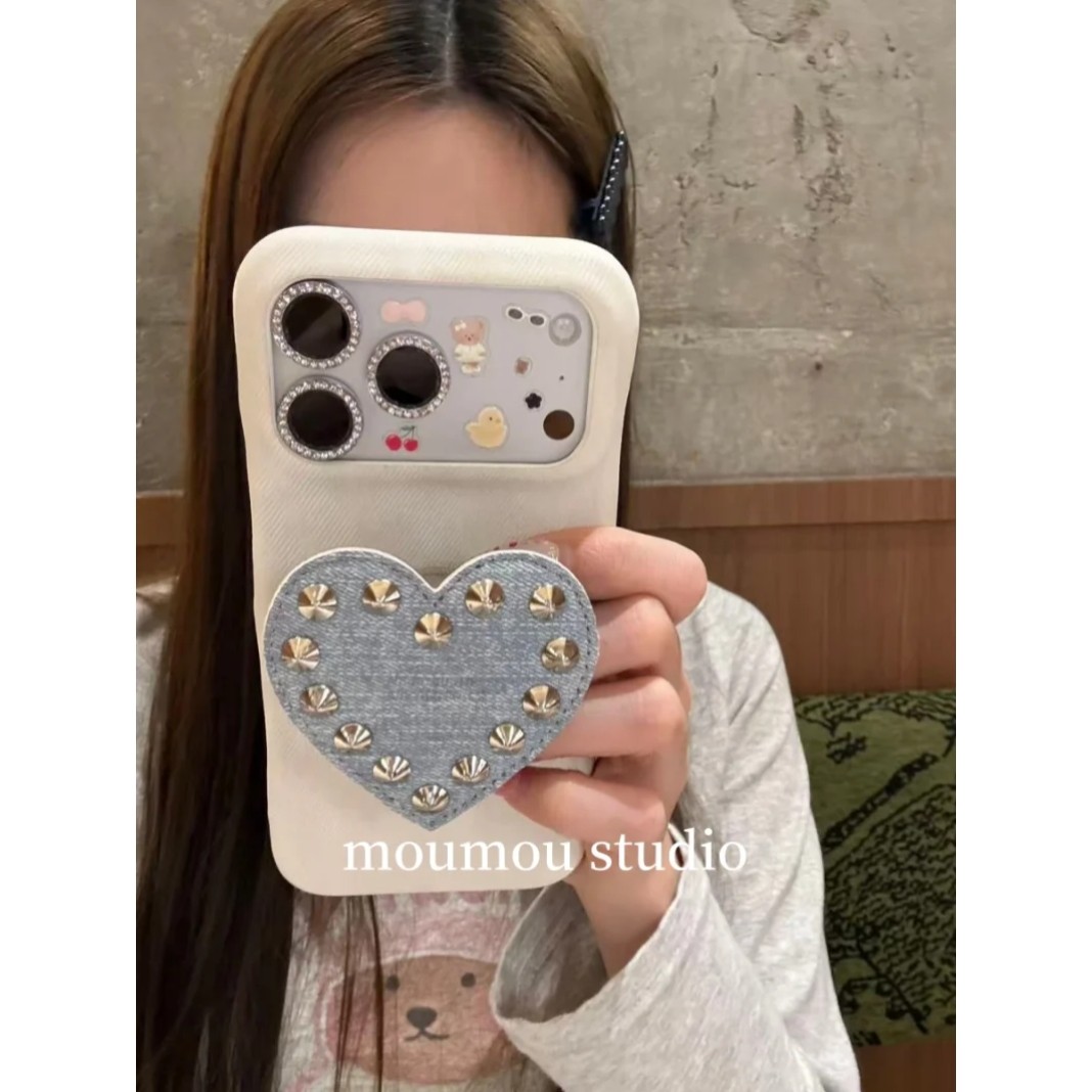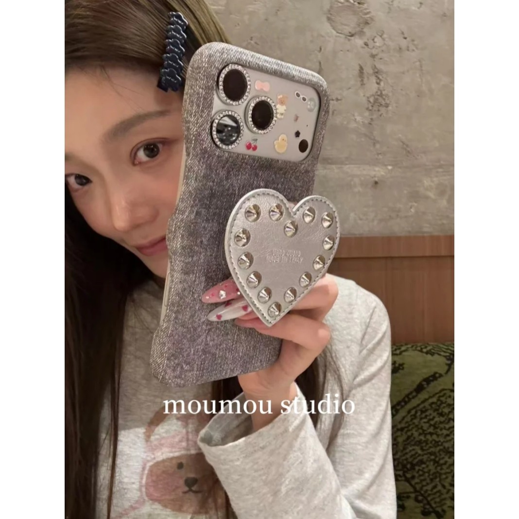 MOMOMOSTUDIS小众ins韩系纯色皮纹铆钉爱心支架适用iPhone17promax新款16pro苹果手机壳15pro全包14防摔13软