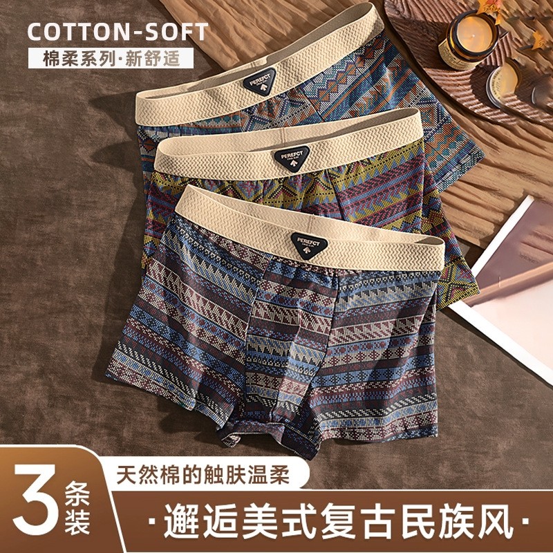 男士内裤纯棉复古印花潮流个性平角舒适美式透气四角民族男士短裤