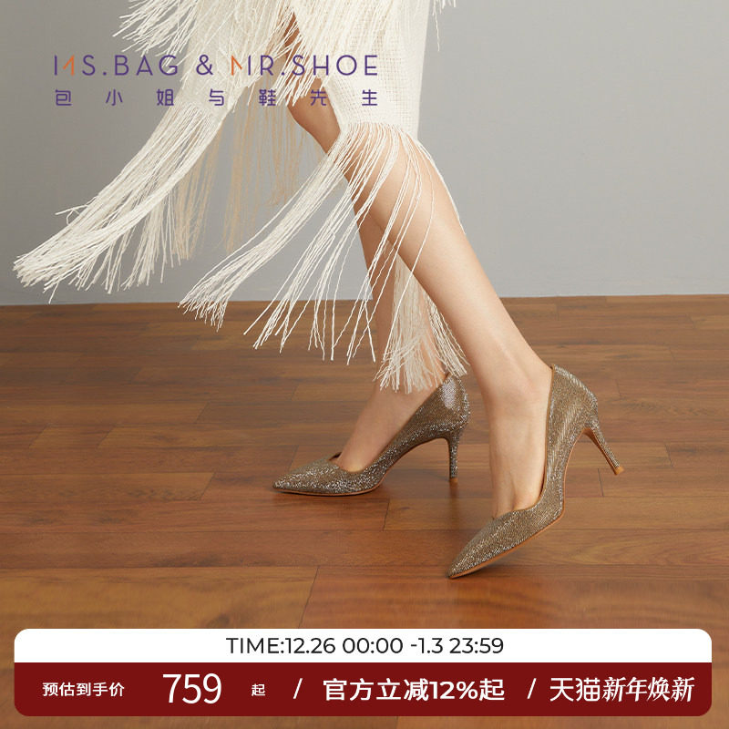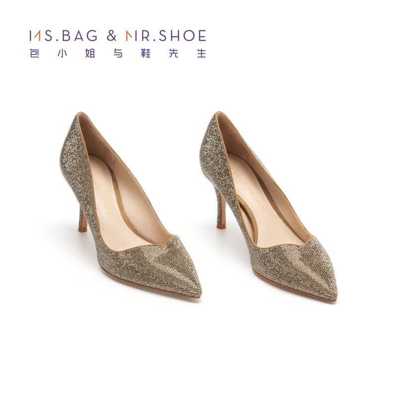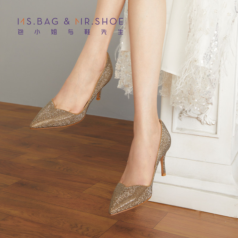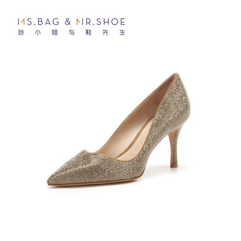 包小姐与鞋先生2025年秋季新款砂金烫钻细高跟浅口单鞋女223015