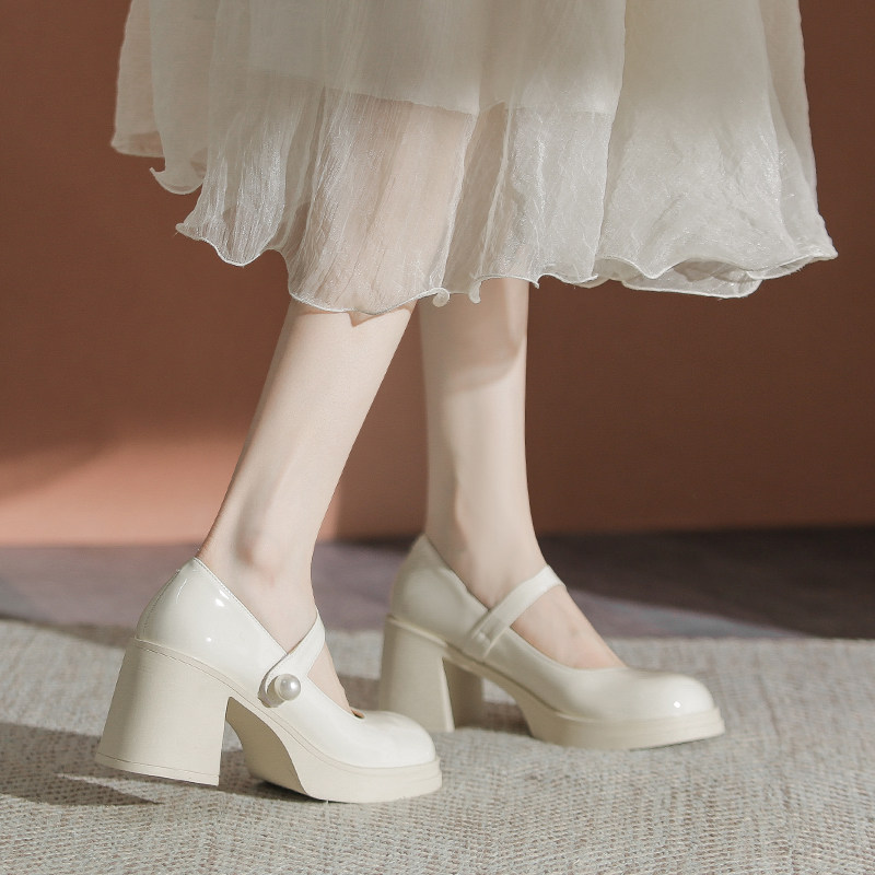 六点大叔真皮粗跟单鞋女2026春季新款珍珠伴娘白色高跟鞋玛丽珍鞋
