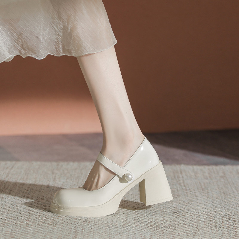 六点大叔 真皮玛丽珍单鞋女法式珍珠仙女鞋一字带浅口粗跟高跟鞋