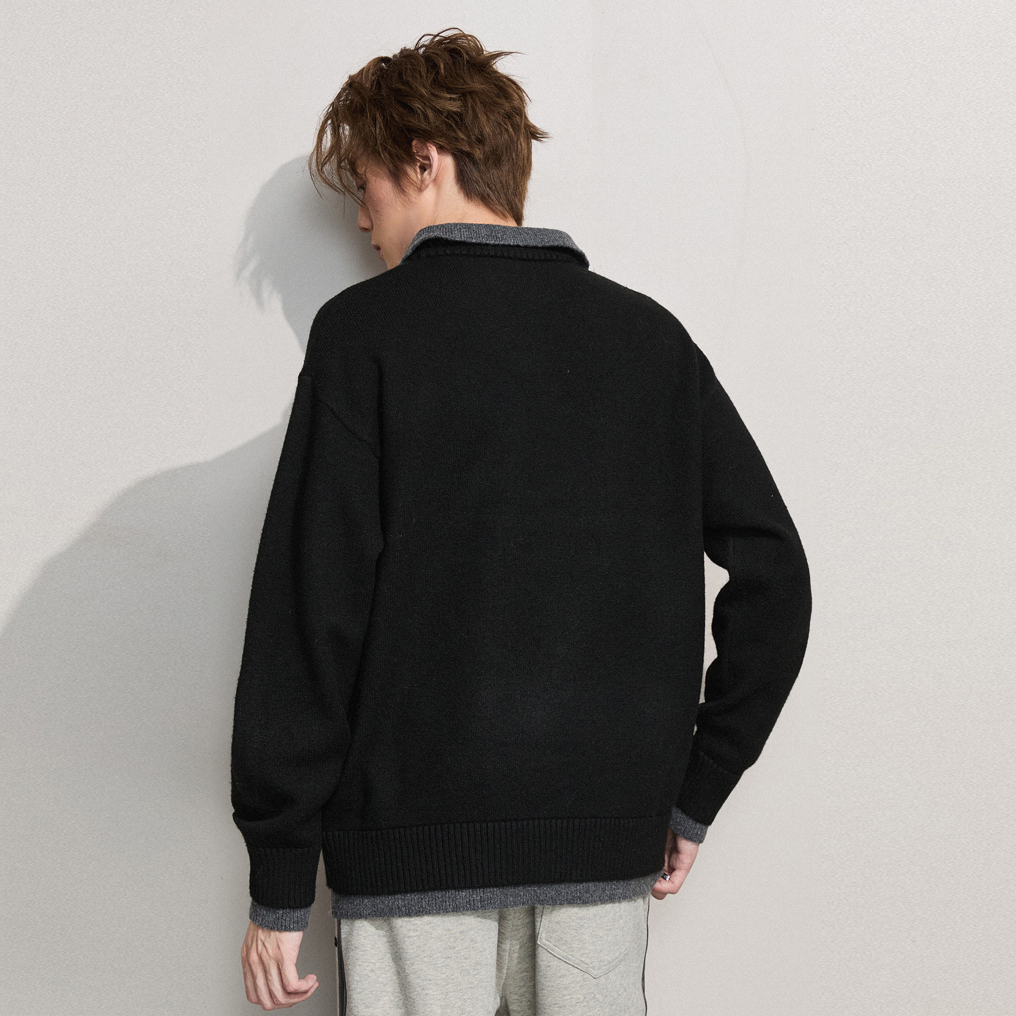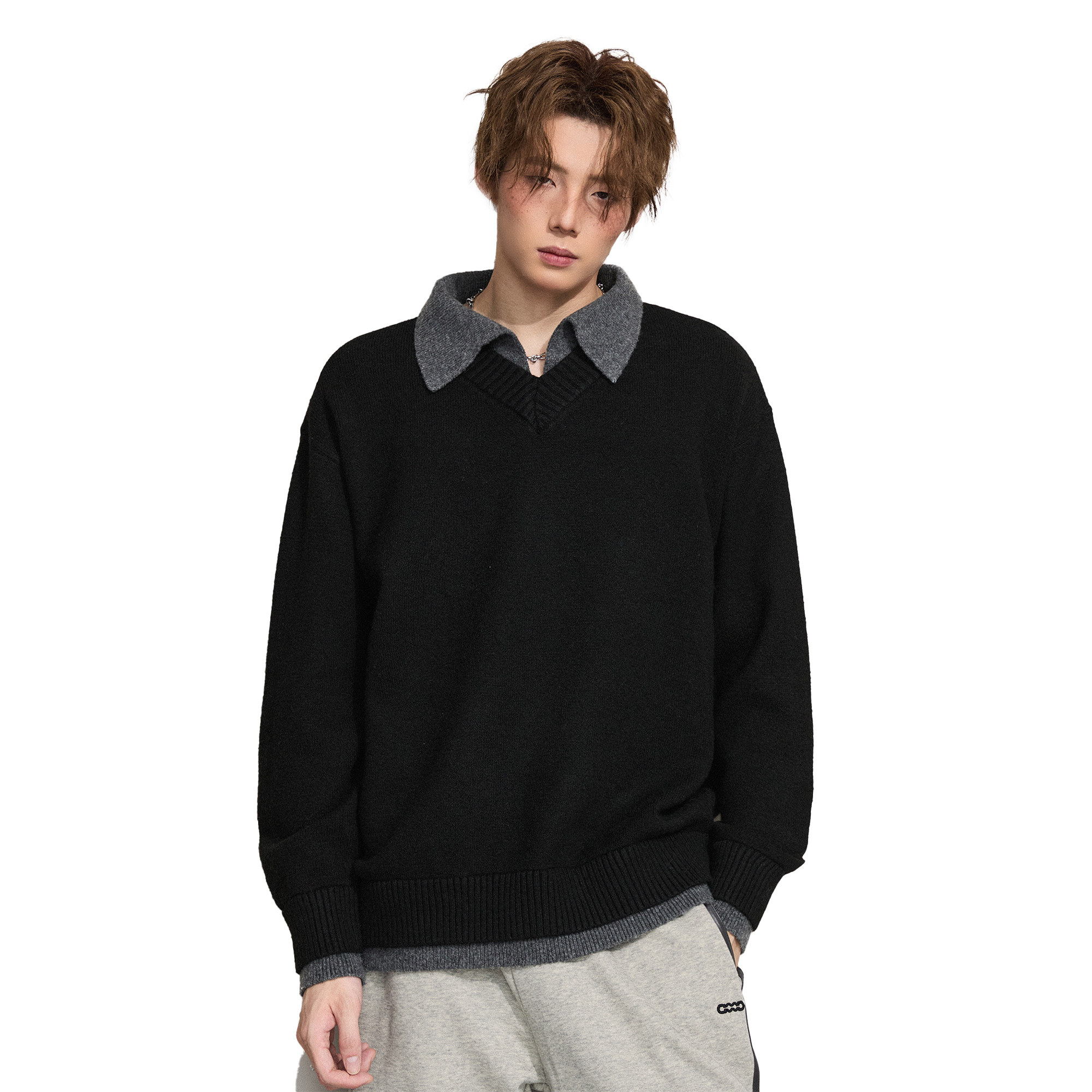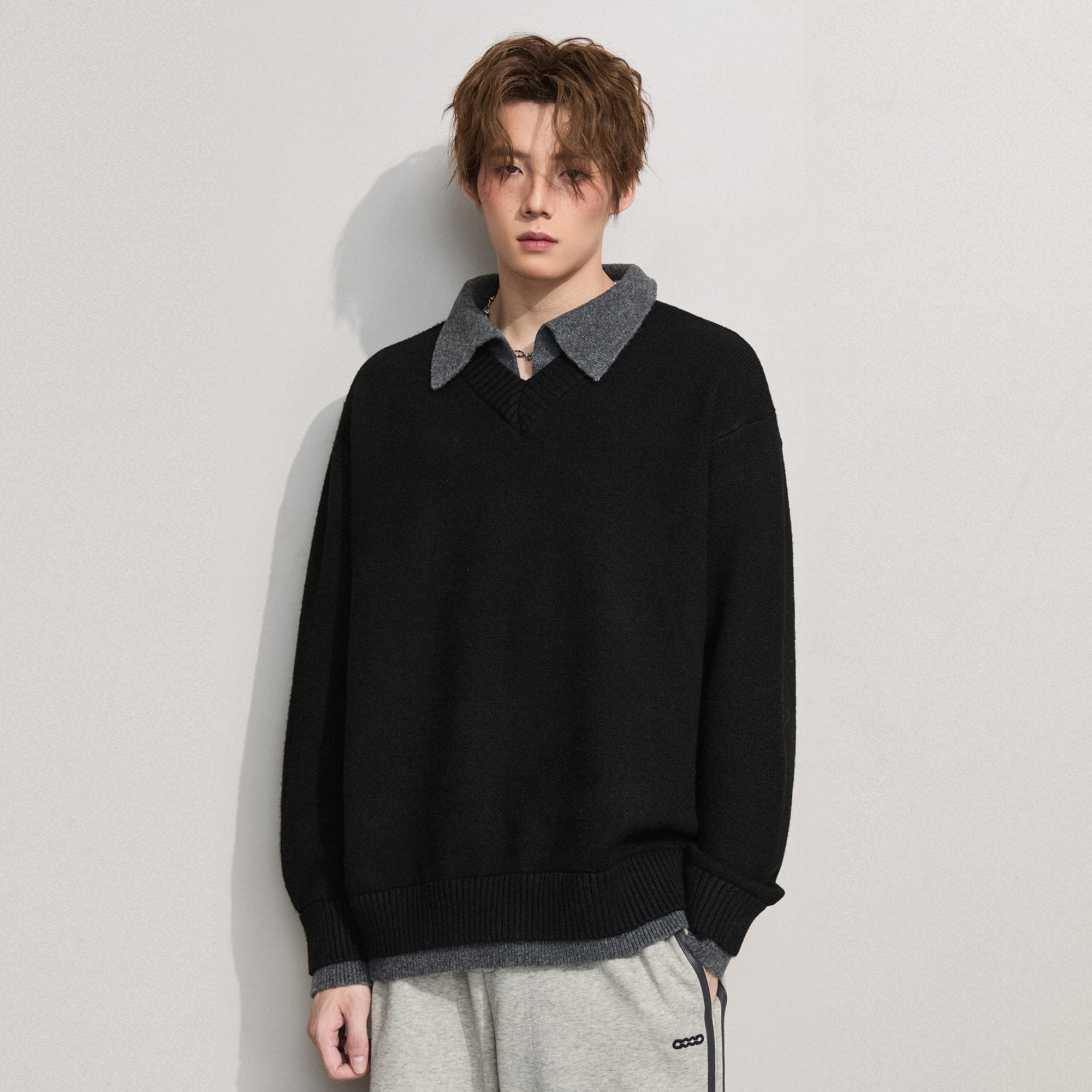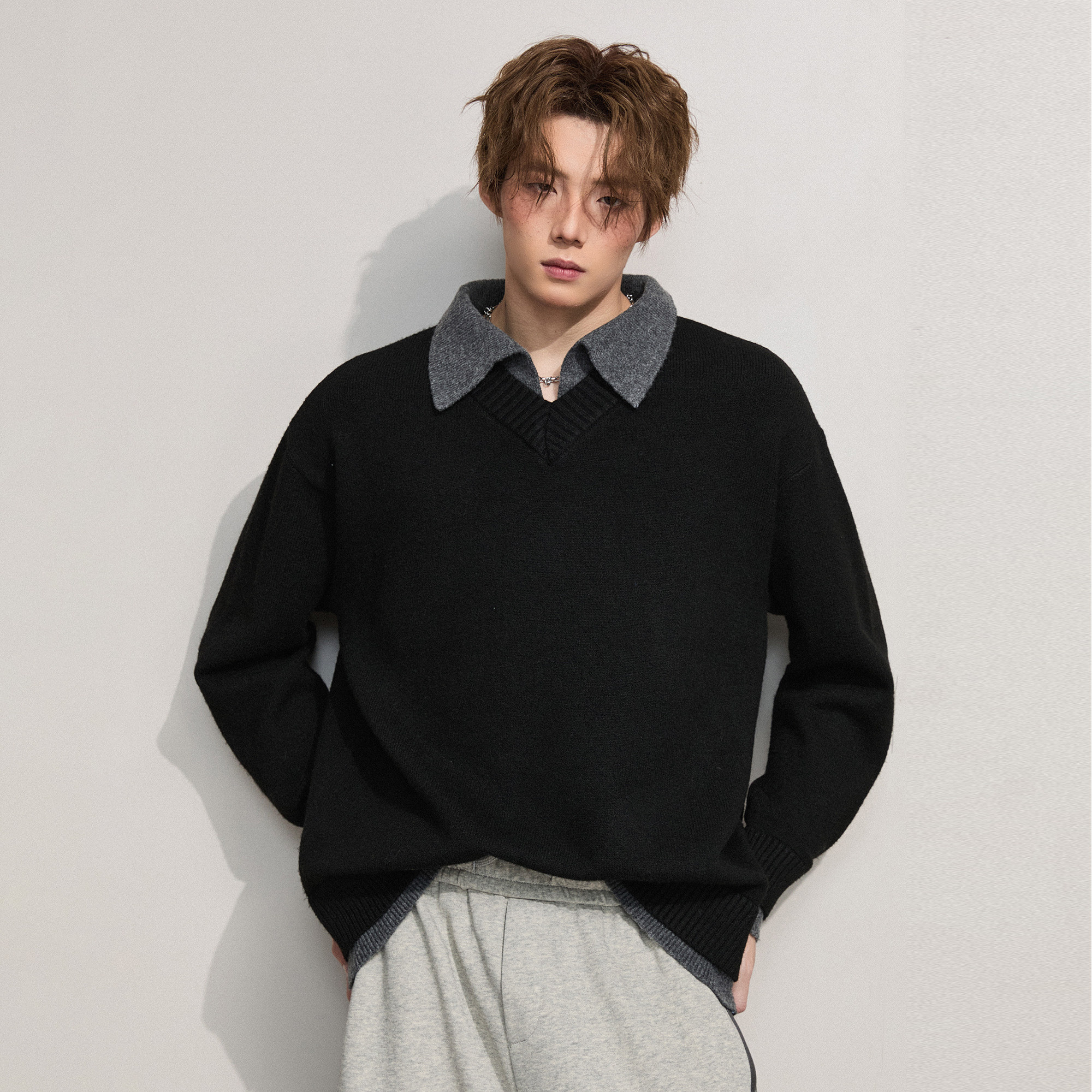ALLIN 假两件v领翻领毛衣男秋冬cleanfit高级针织衫上衣慵懒外套