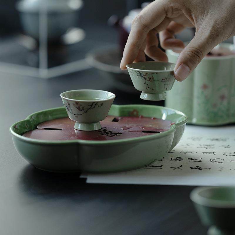无落 果青釉下彩手绘雏菊海棠壶承带铜片蓄水茶盘干泡小茶台功夫