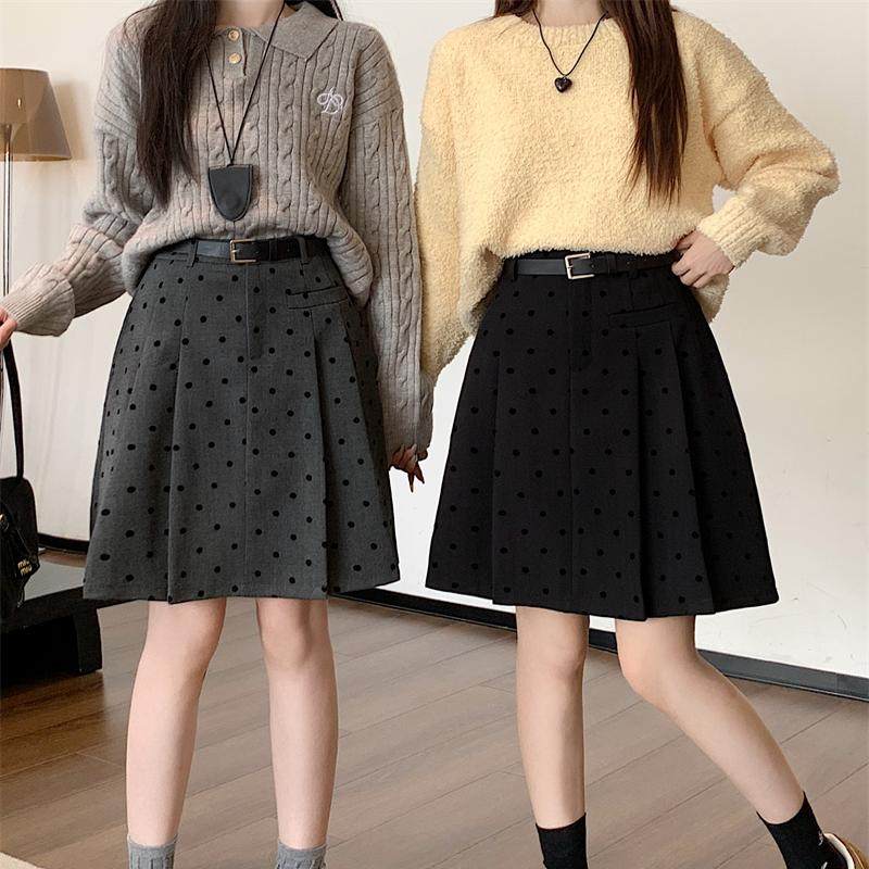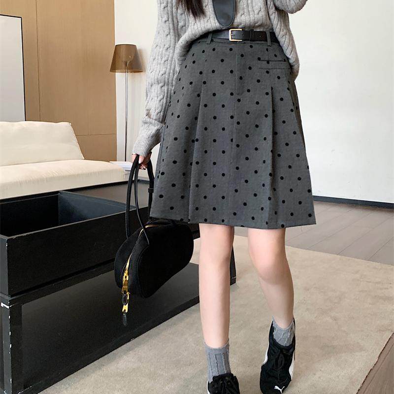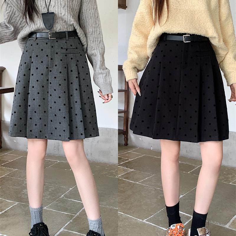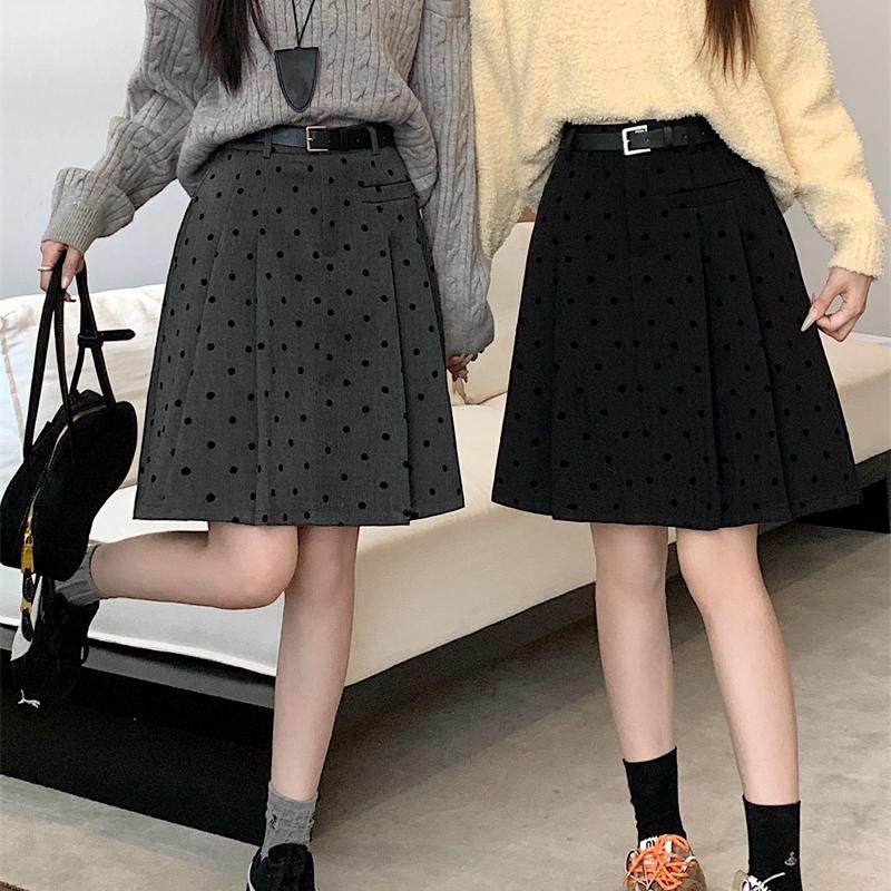 大码灰色波点百褶裙女中长款秋冬高腰遮胯a字裙设计感包臀半身裙