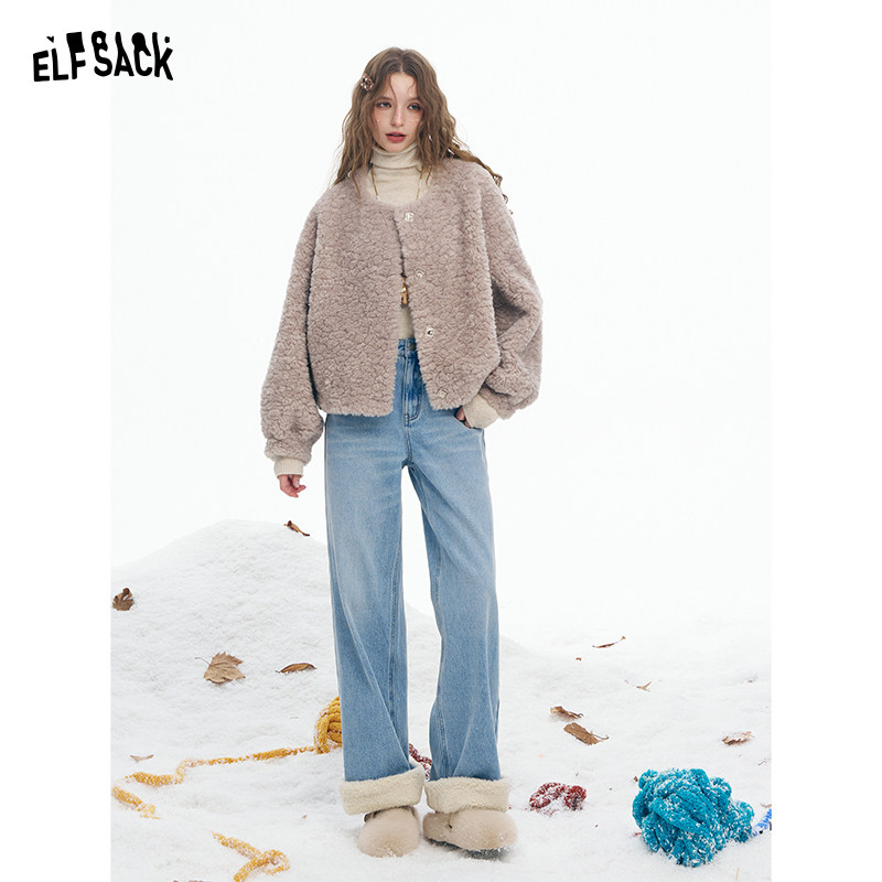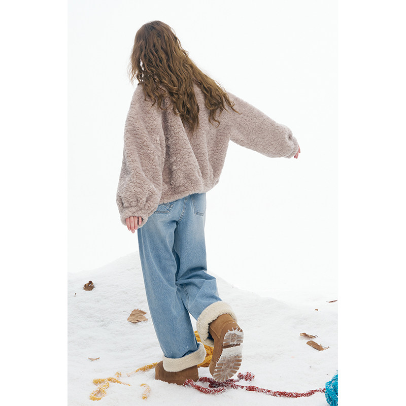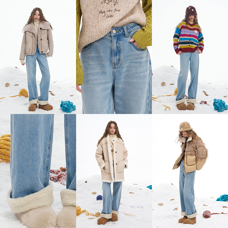 妖精的口袋毛绒拼接浅色加绒牛仔裤女2025年冬季新款阔腿裤直筒裤