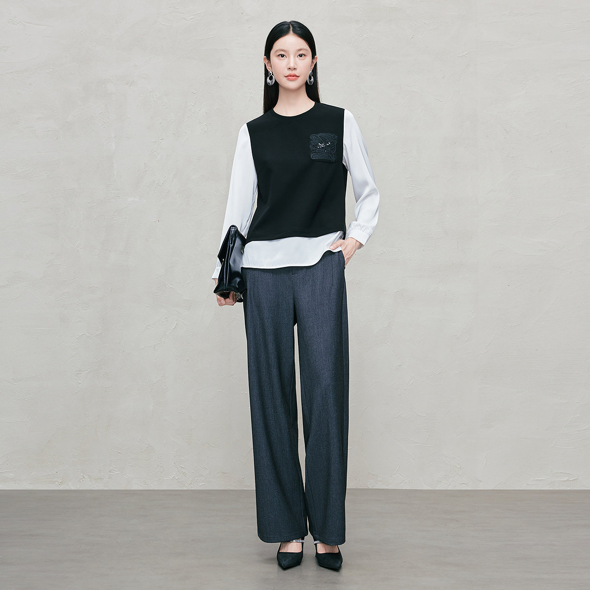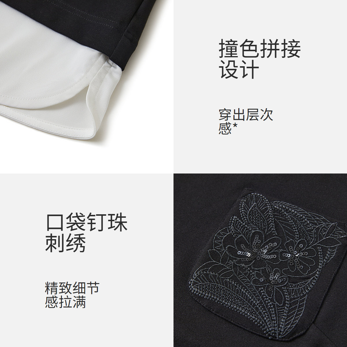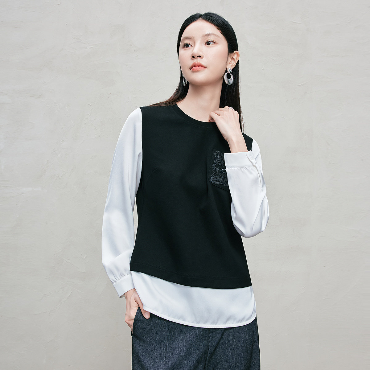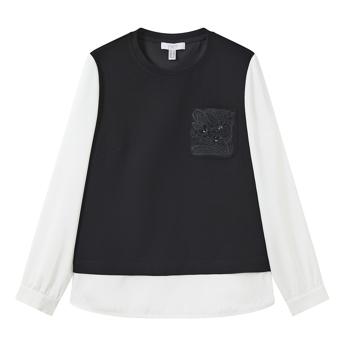 FINITY菲妮迪雪纺衫2025年秋季新款简约钉珠刺绣撞色拼接上衣女士