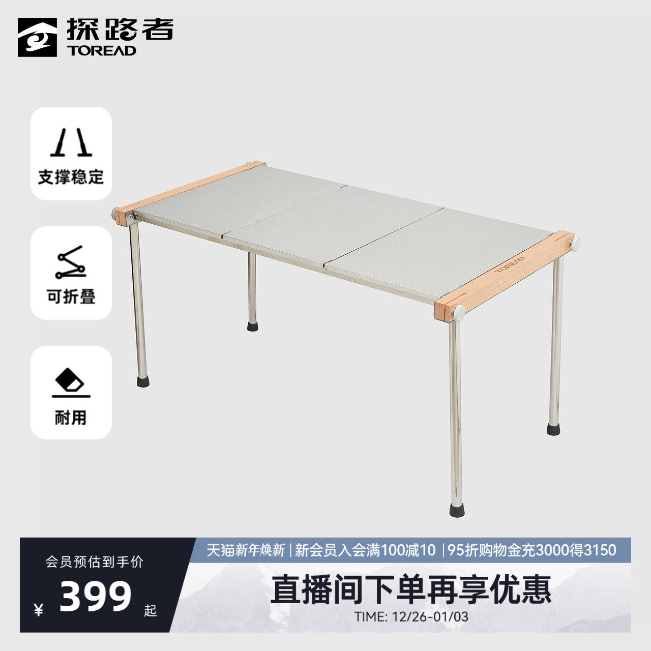 探路者不锈钢折叠桌户外露营野餐便携式野外野营桌面耐用轻便收纳