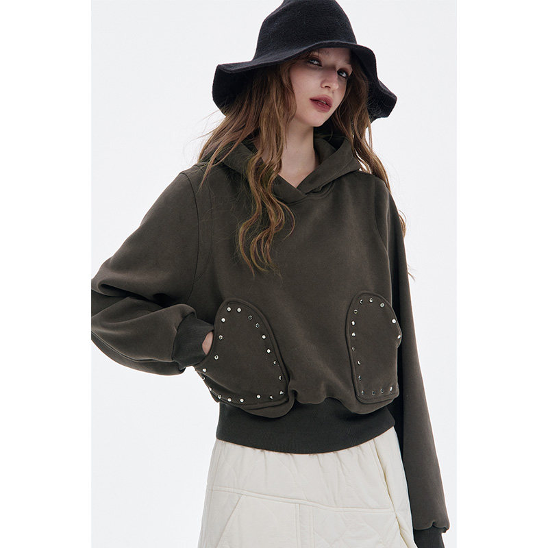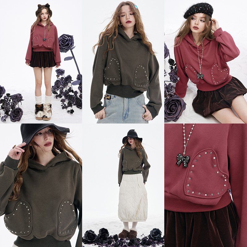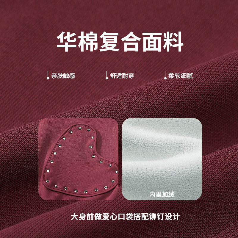 妖精的口袋铆钉连帽加绒卫衣女2025年冬新款圣诞穿搭短款红色上衣