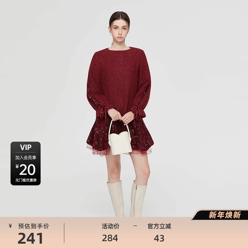 【新年款】sdeer圣迪奥女装复古系带网纱亮片毛呢外套S234Z2261