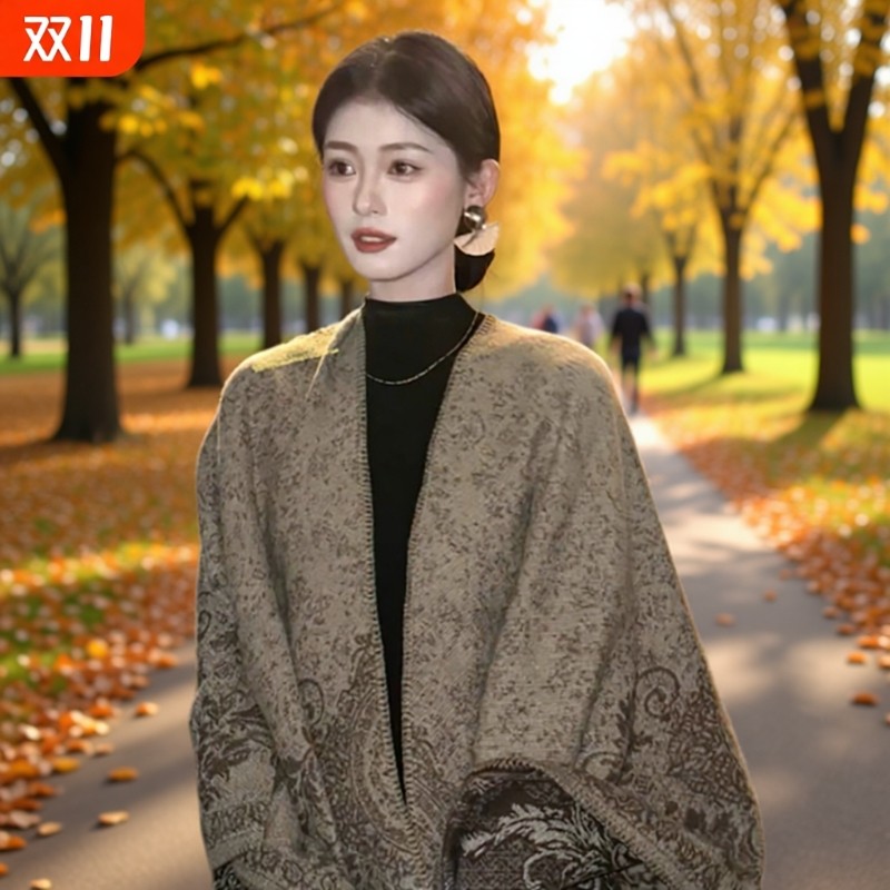 波西米亚民族风复古披肩外搭女川西云南保暖披风斗篷围巾冬季棕色