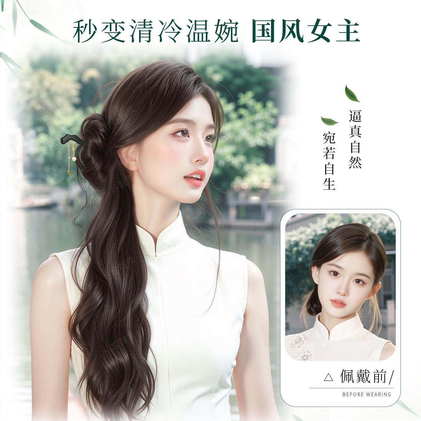 新中式假发抓夹女侧马尾汉服旗袍编发发簪古风仿真发辫子花苞发型