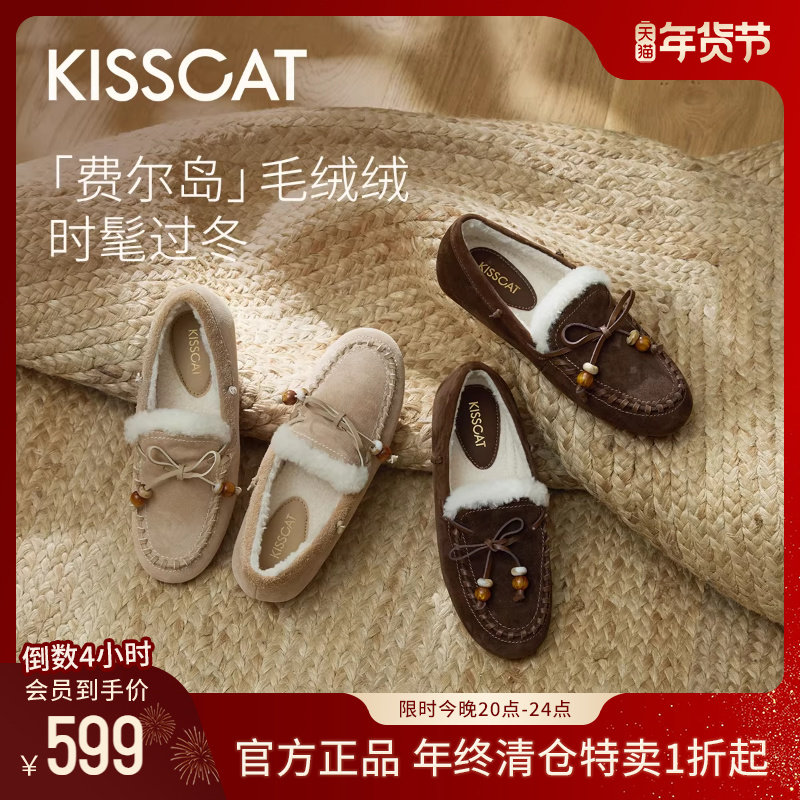 KISSCAT接吻猫[费尔岛]豆豆鞋冬季真皮软底加绒乐福鞋女毛毛单鞋