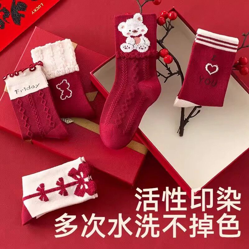 女童袜子秋冬纯棉儿童红色冬季新年本命年红袜宝宝童袜一双装白色