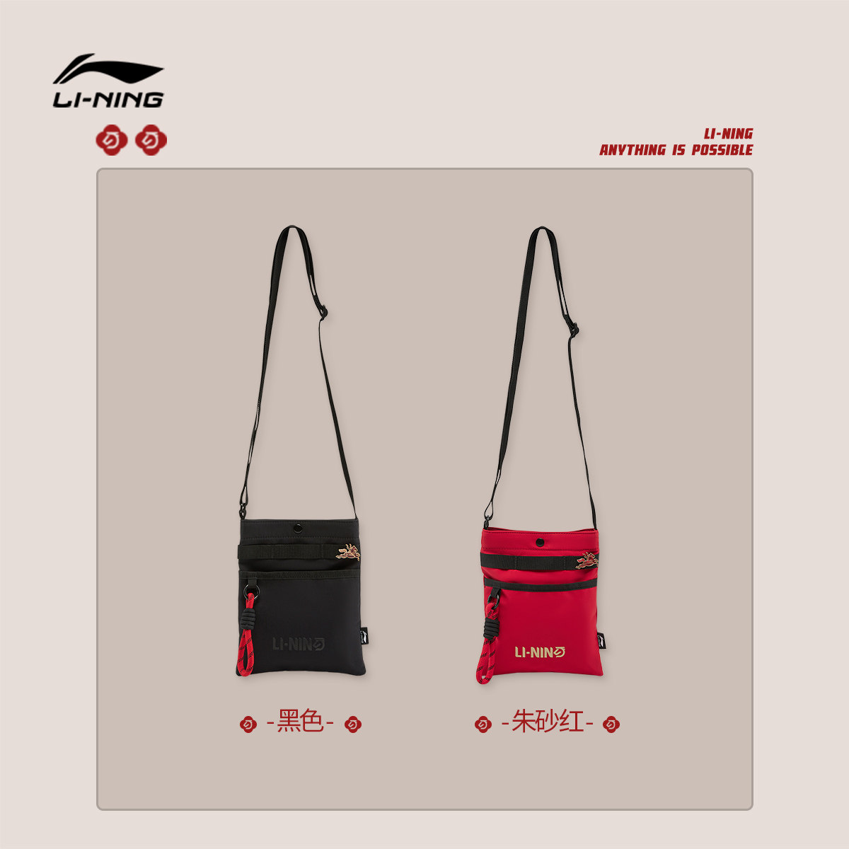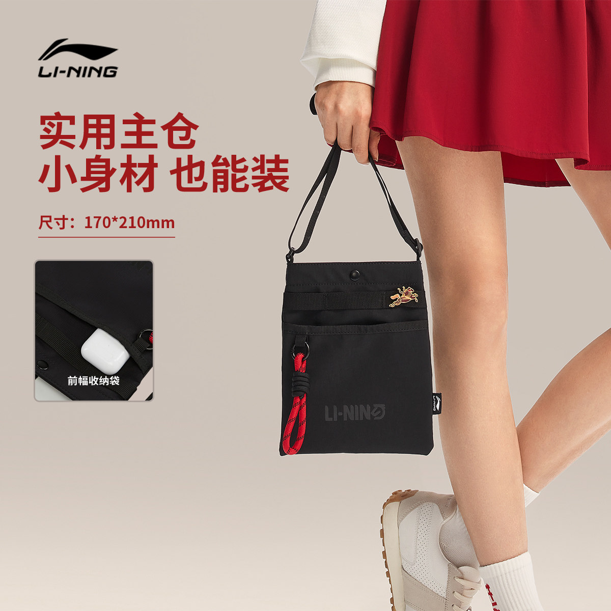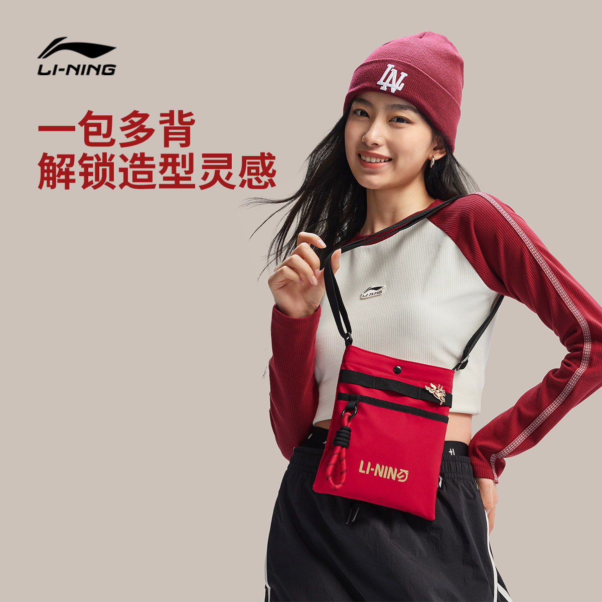 李宁日进斗金斜挎包男女新年鸿运穿搭红色便捷运动包手机包小方包