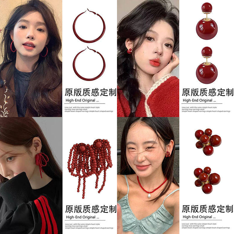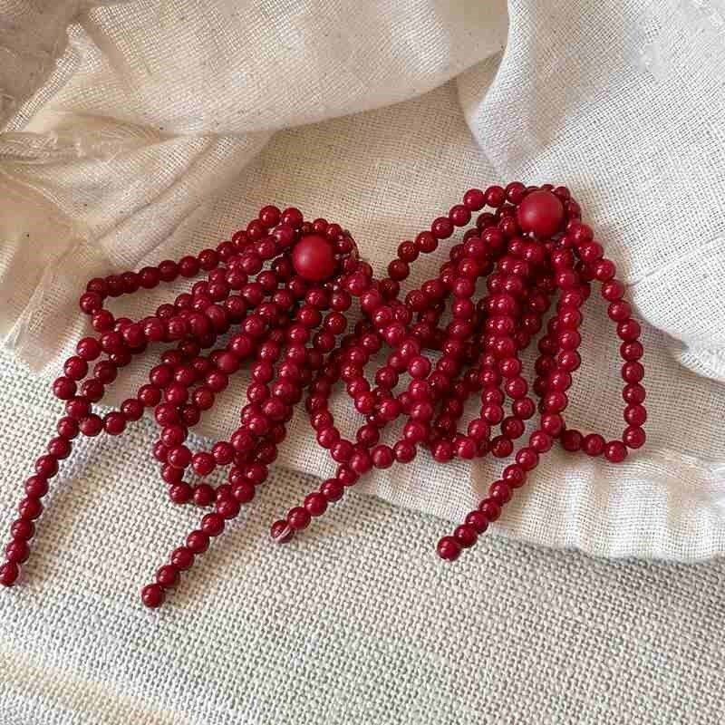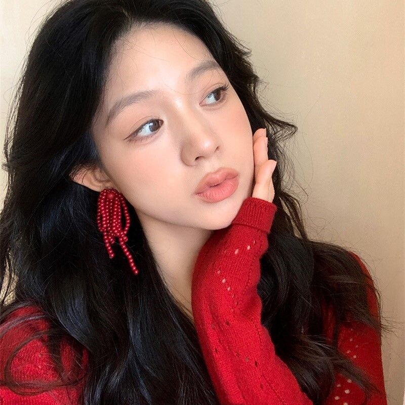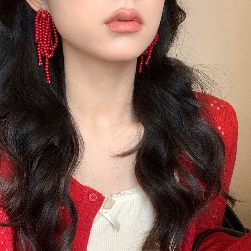 复古红色串珠流苏耳钉女2024新款显脸小耳钉小众设计安可拉红耳饰