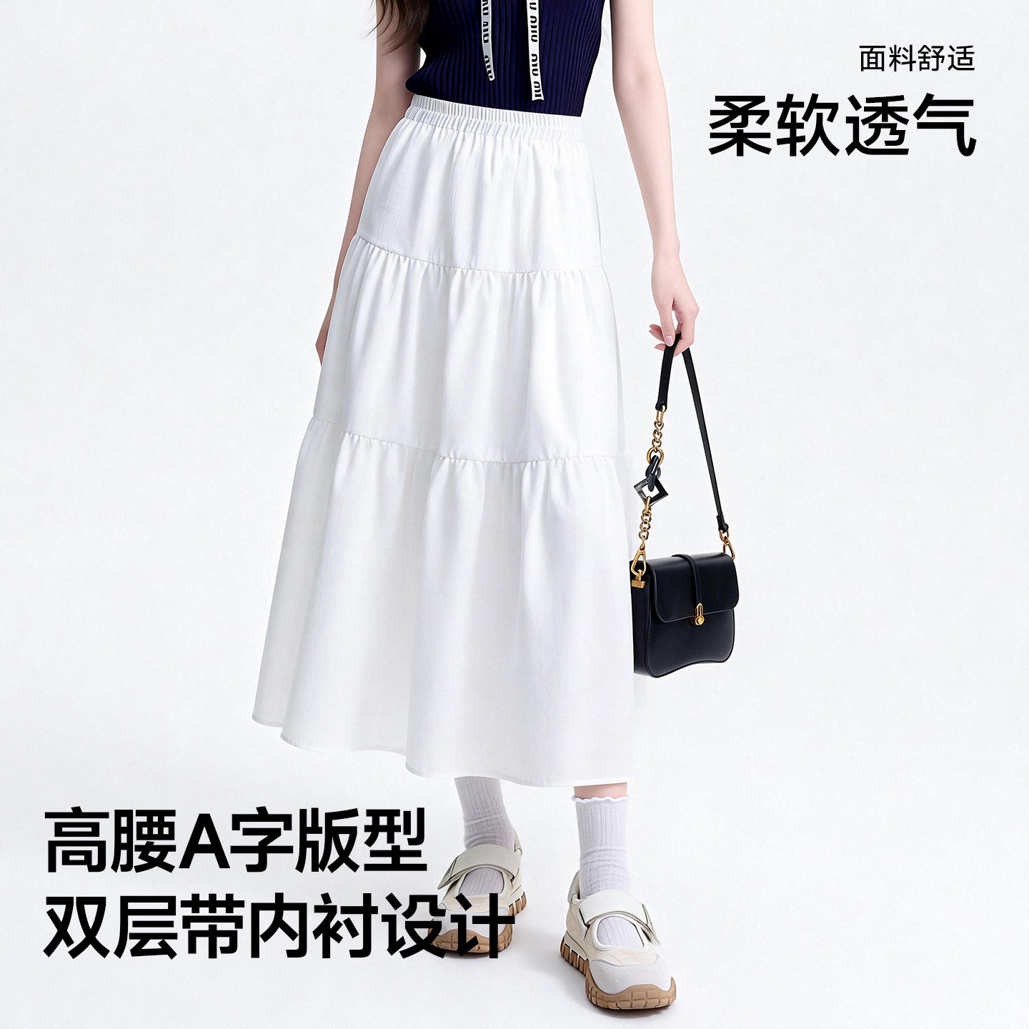 森马半身裙女夏季松紧腰肌理垂感分割A字裙宽松松弛感山本风长裙