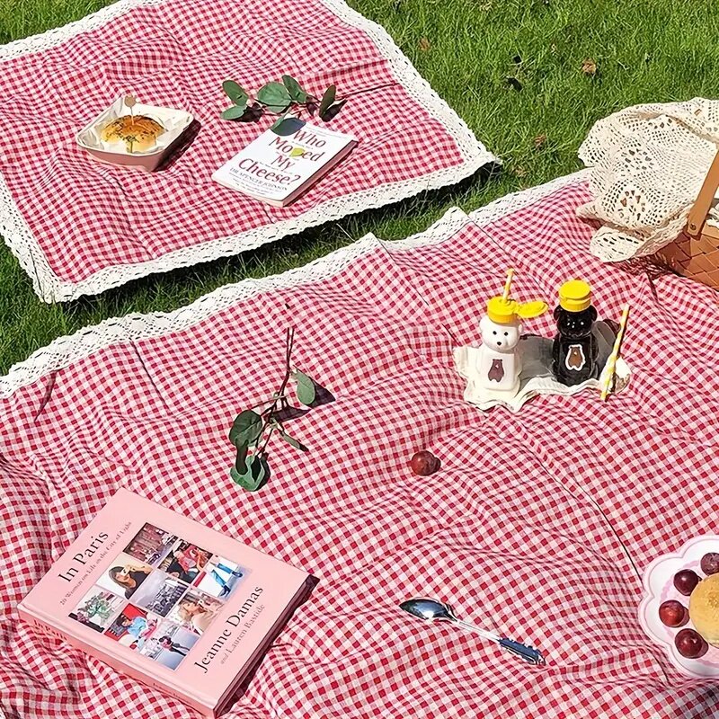 蕾丝边野餐垫创意法式复古红格纹餐布女生布艺氛围感春游拍照道具