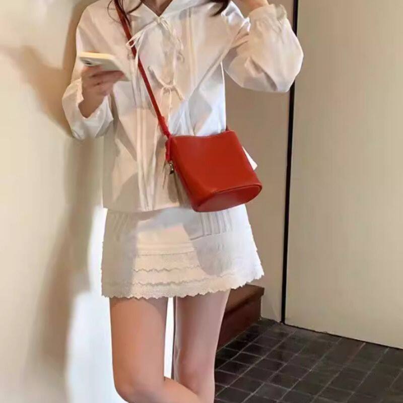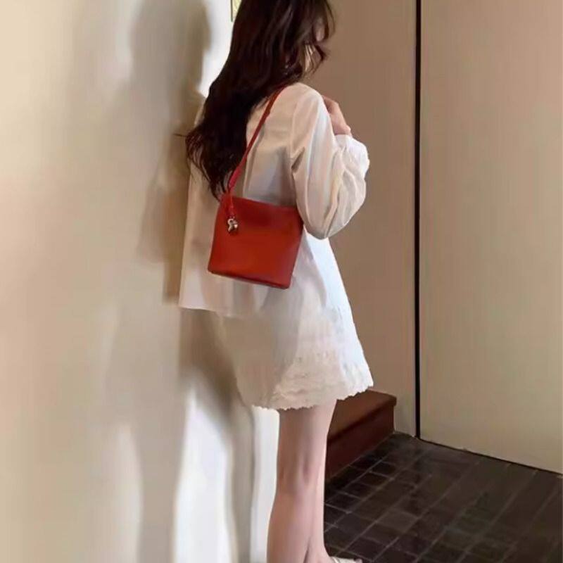 复古简约红色斜挎包PU皮麦田派对水桶包包女单肩斜挎小包INS