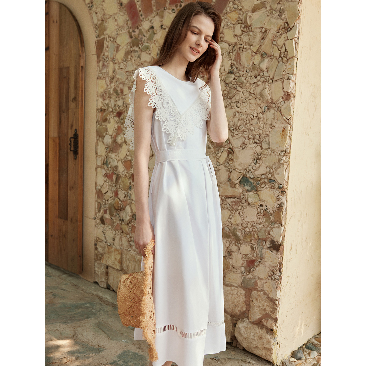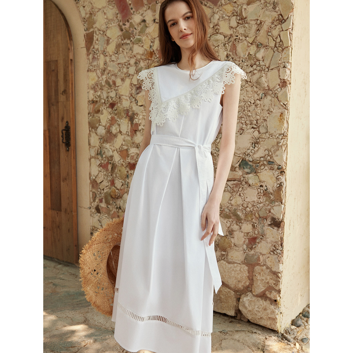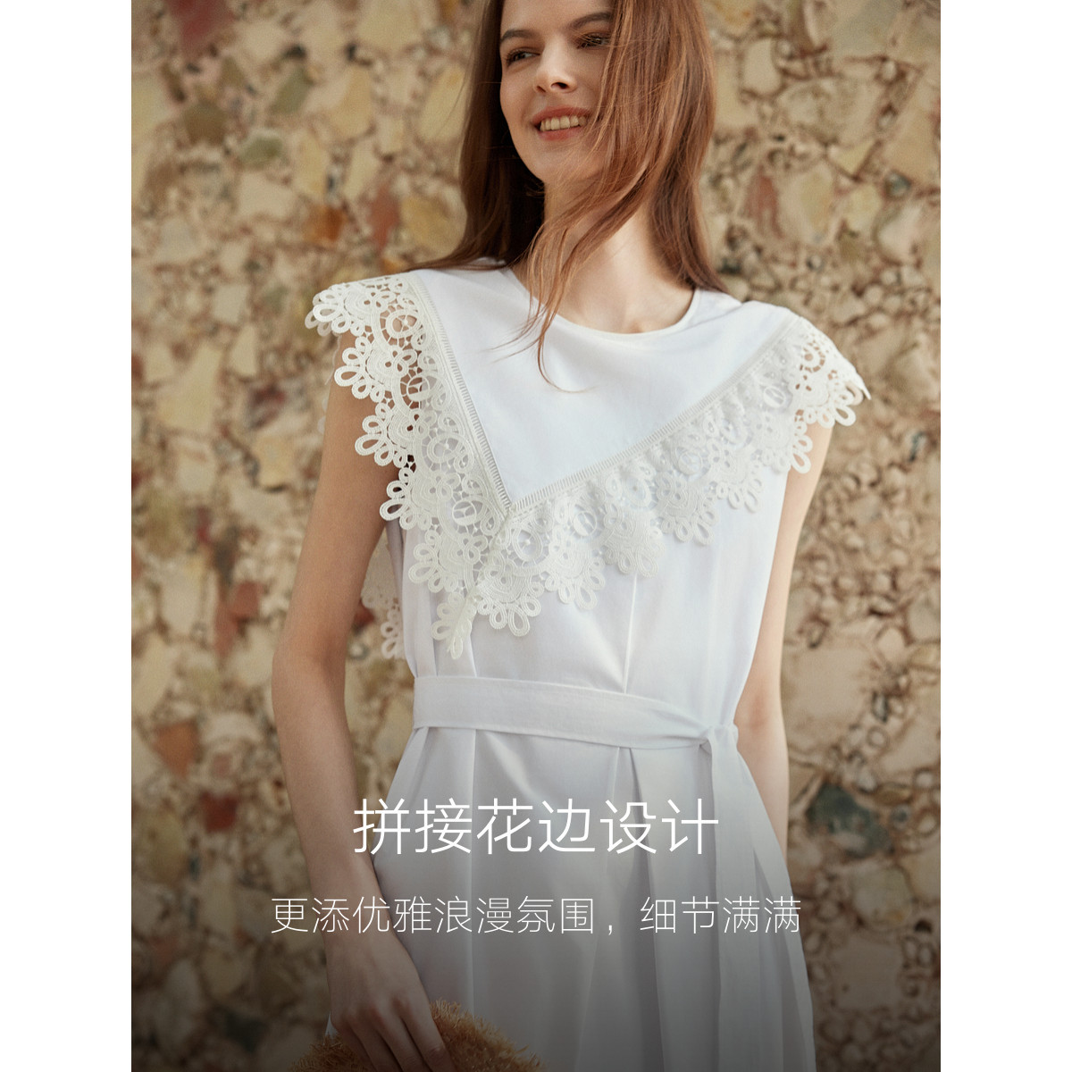 ELLE白色淑女风拼接花边连衣裙女2025夏季新款优雅纯棉法式长裙