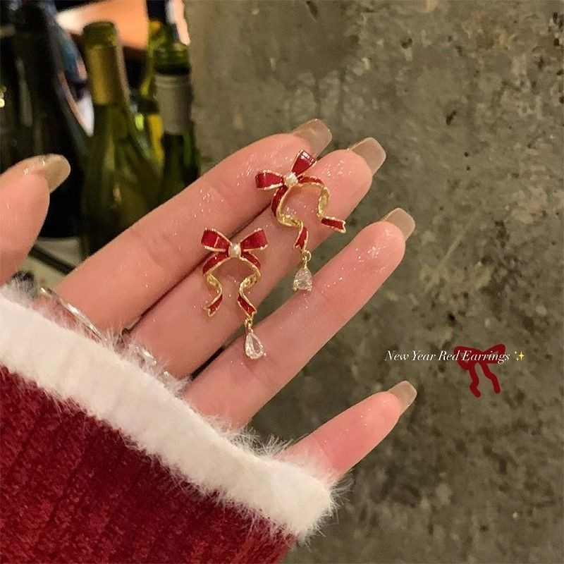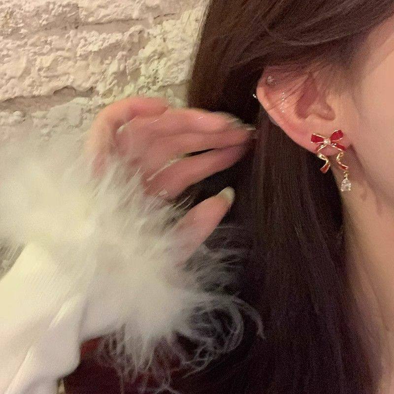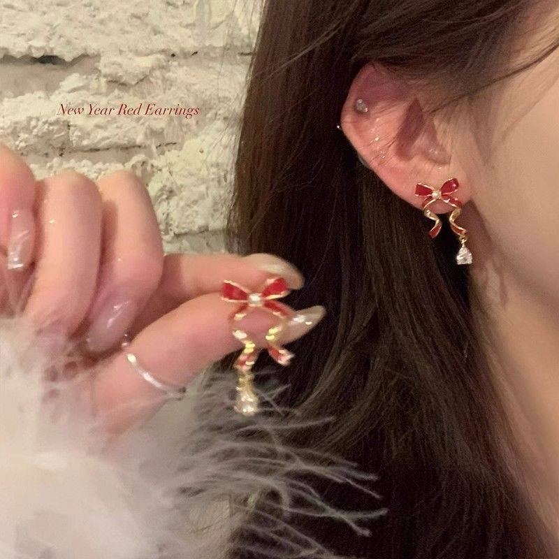 秋冬新年红色蝴蝶结飘带耳环锆石耳钉女耳饰轻奢高级感耳夹无耳洞