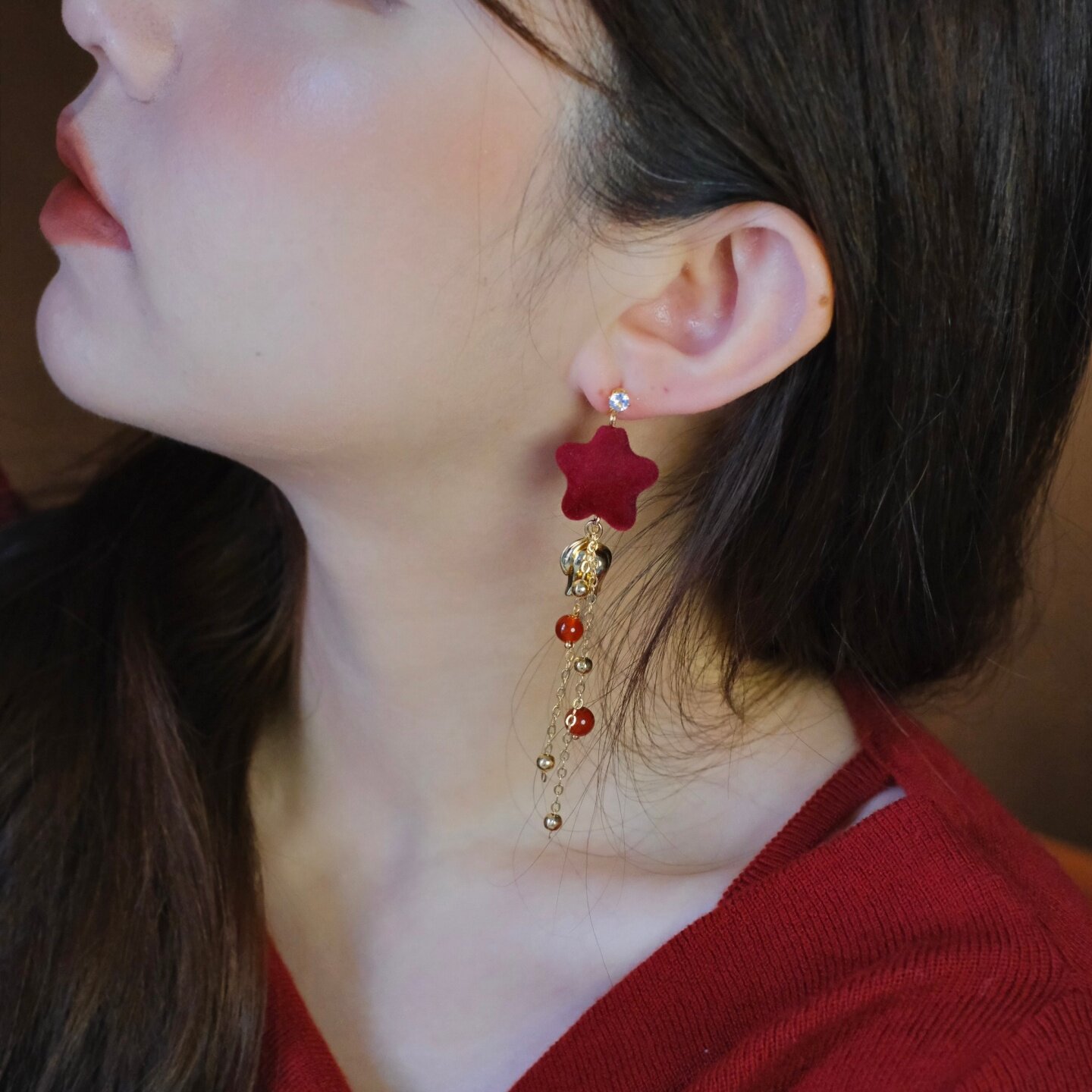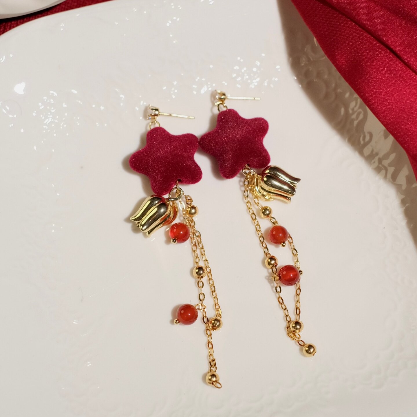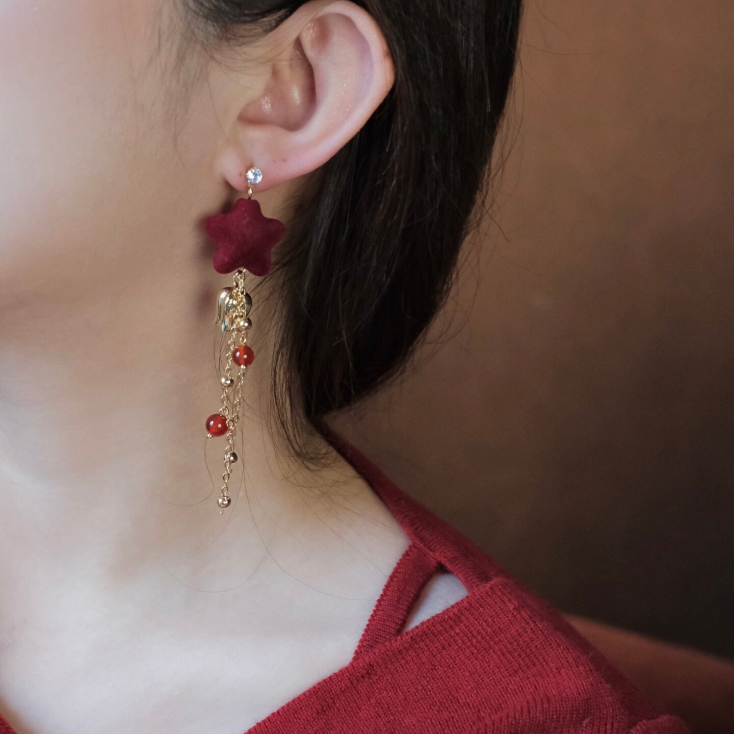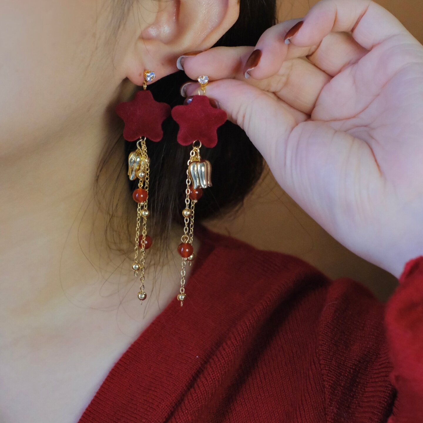 《圣诞星星》原创秋冬酒红色丝绒花朵长流苏玛瑙耳环耳夹耳饰新年