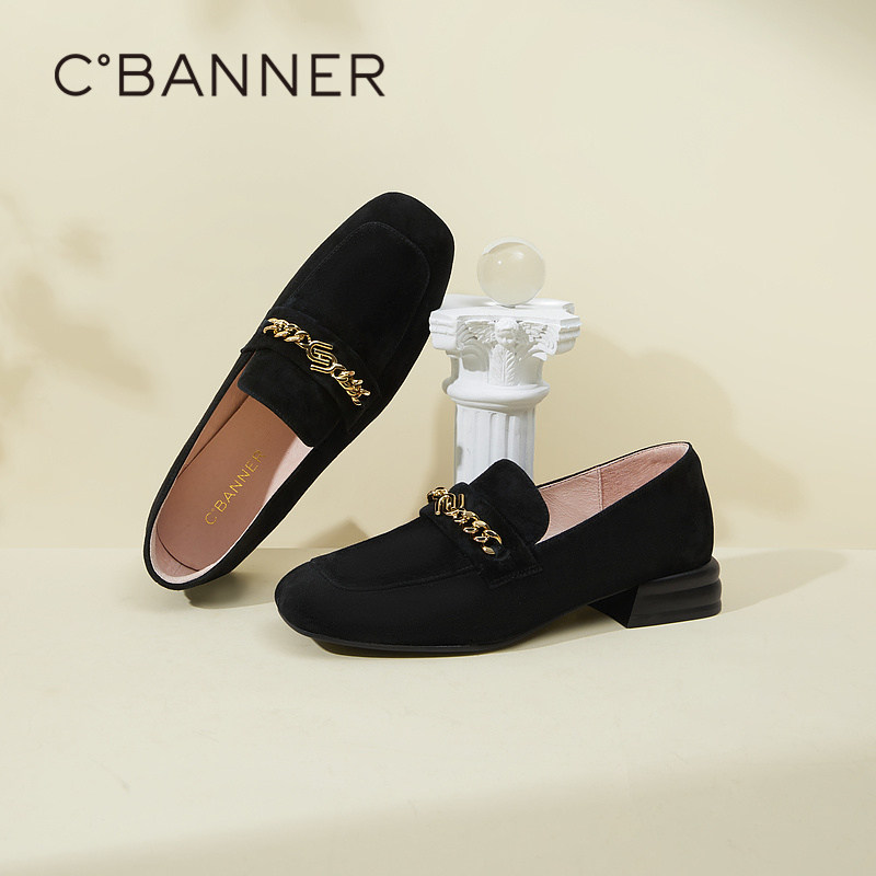 千百度百搭乐福鞋女秋季新款小皮鞋正装羊皮绒面豆豆鞋通勤