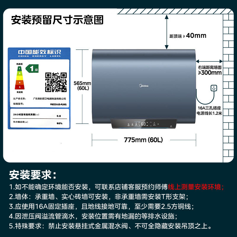 美的扁桶电热水器双胆速热家用洗澡卫生间超短60/80升大容量UDP