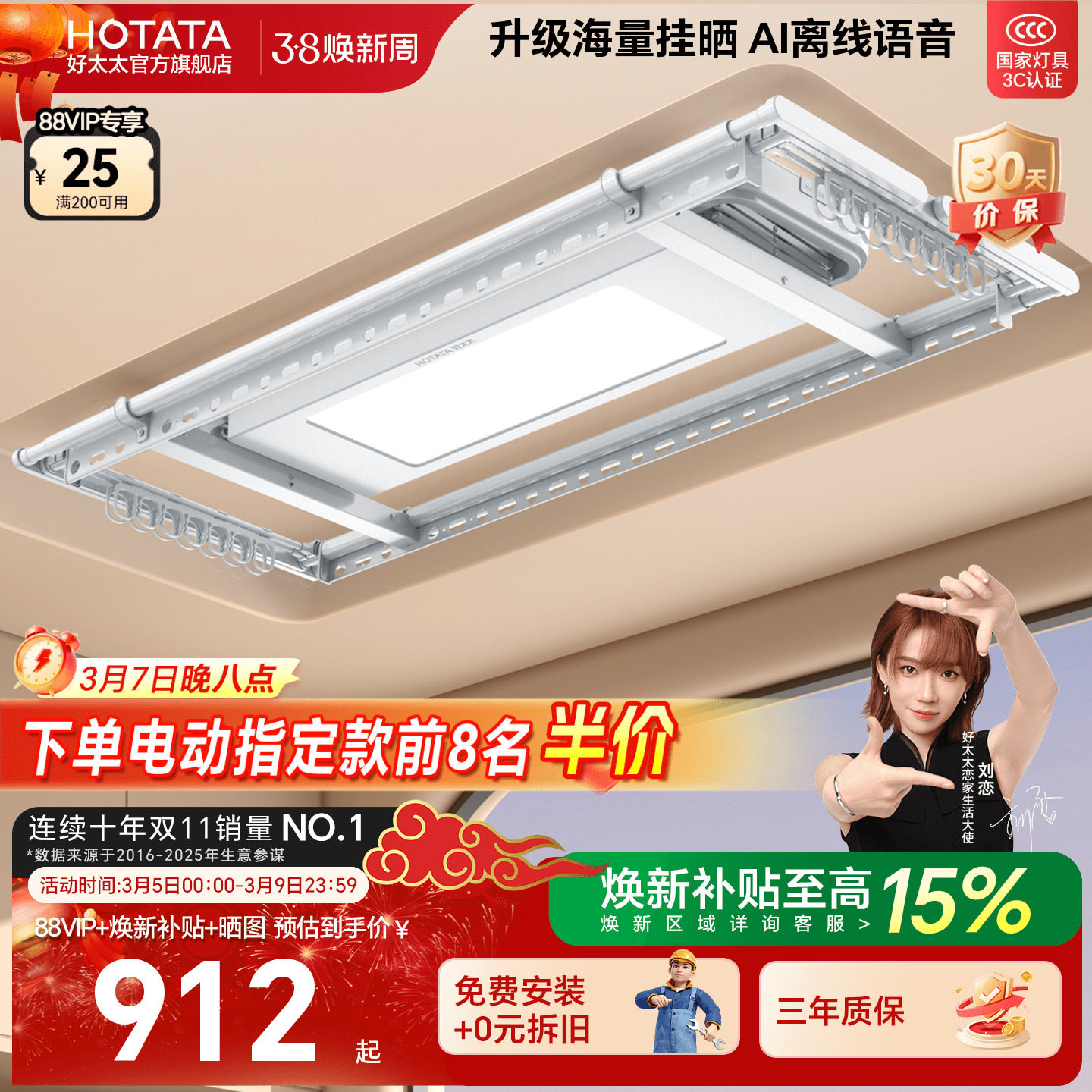 好太太电动晾衣架阳台家用遥控升降晒衣架智能超薄自动晾衣杆神器