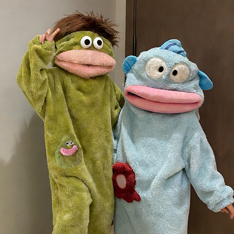 大嘴怪珊瑚绒睡衣女款冬季男加绒加厚可爱搞怪丑鱼睡袍连体家居服