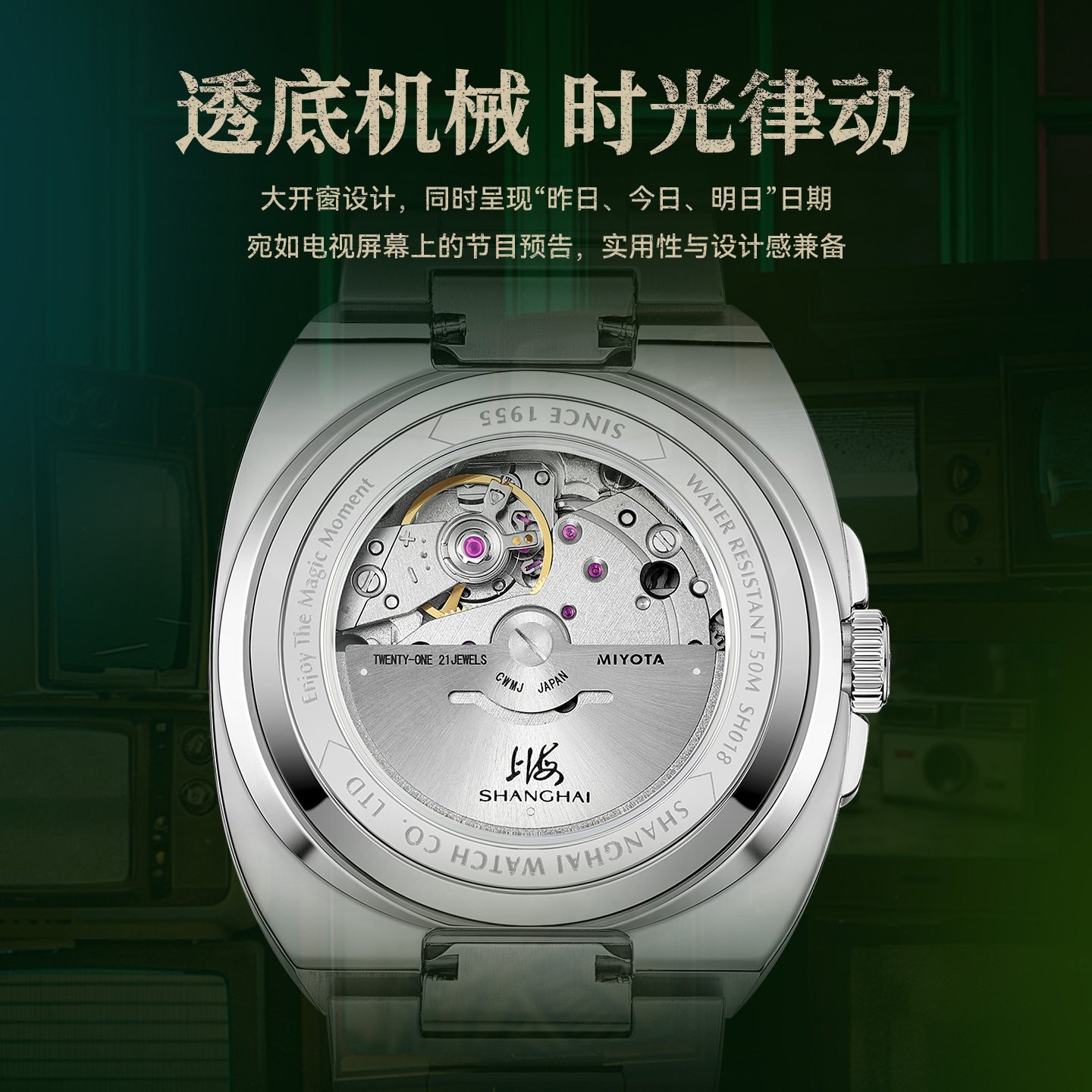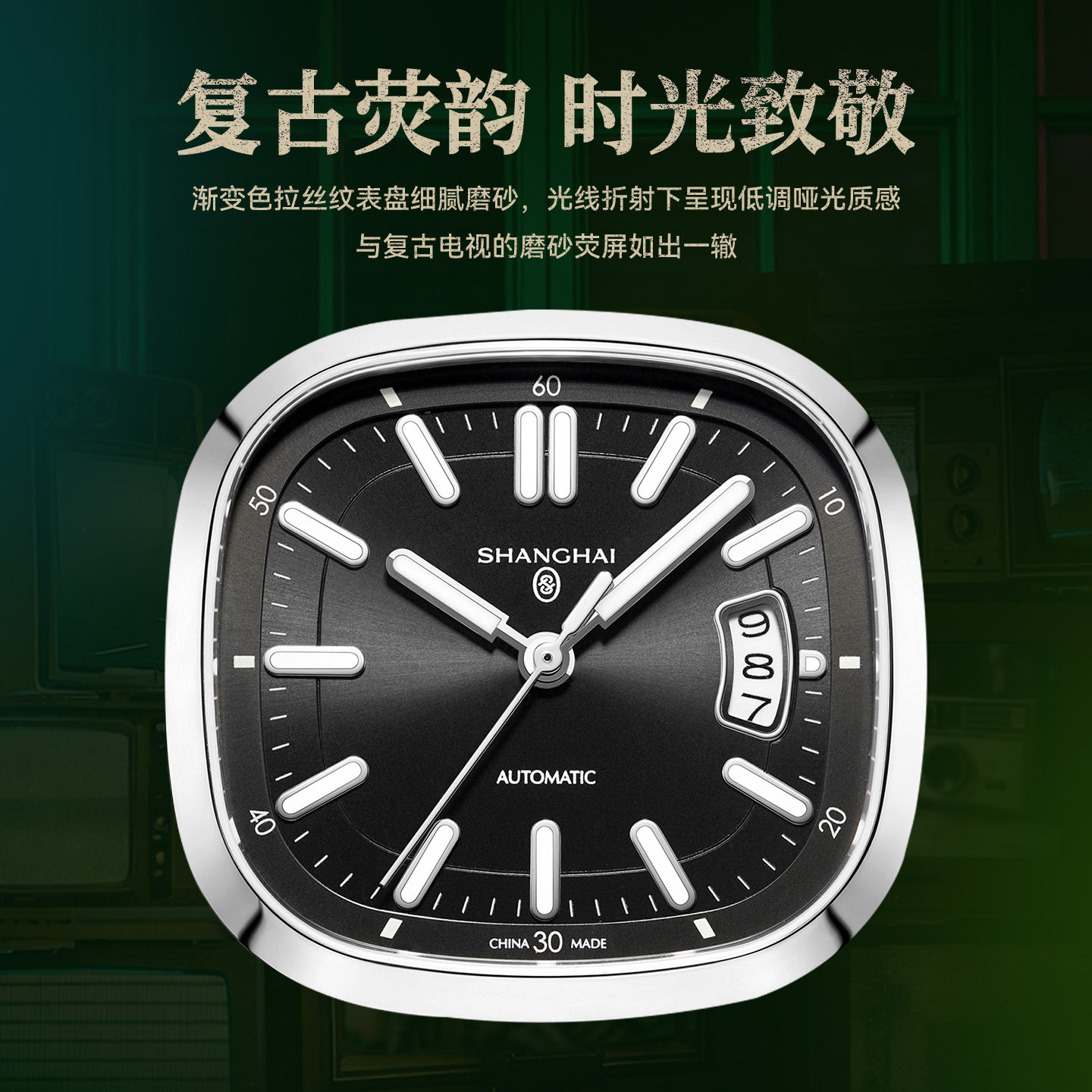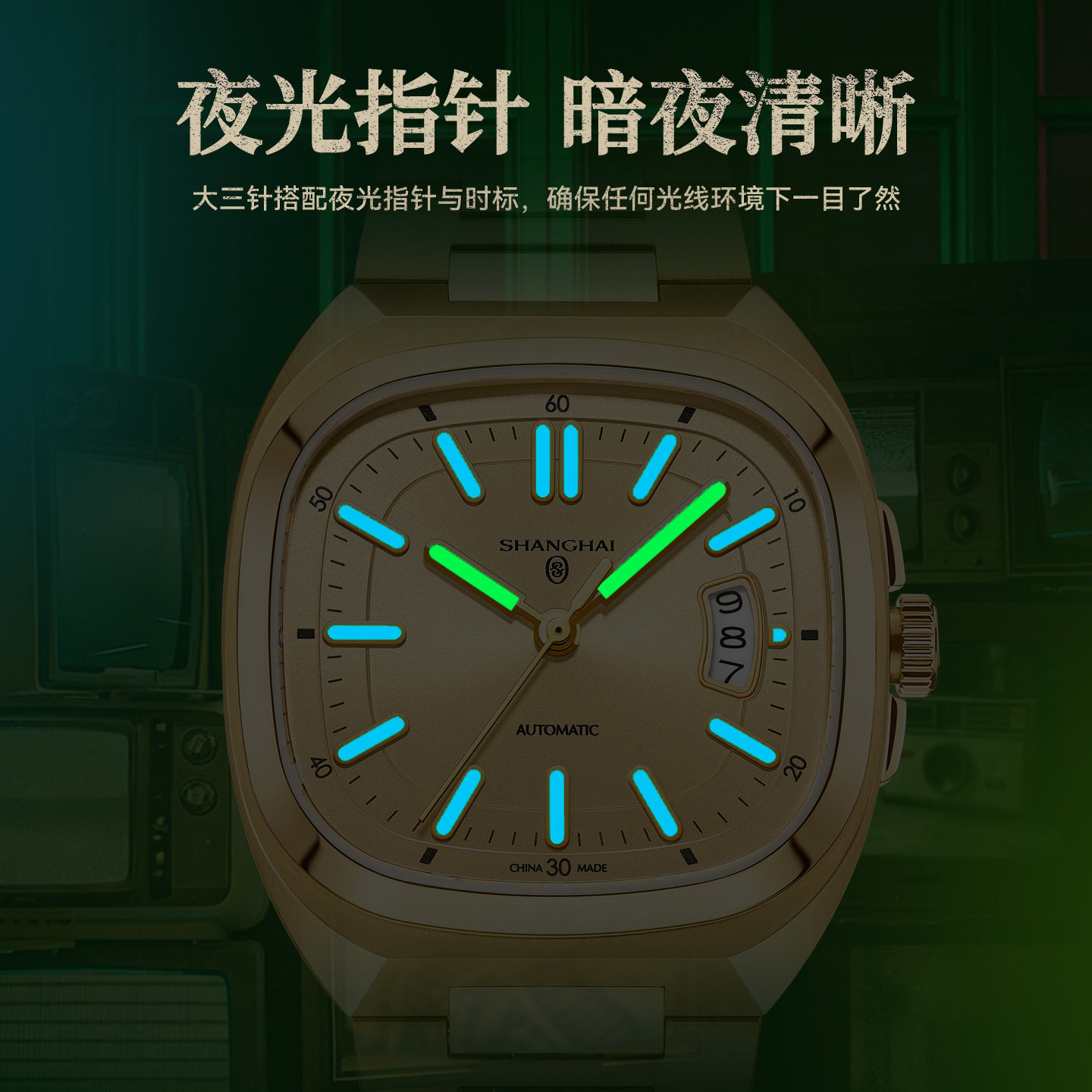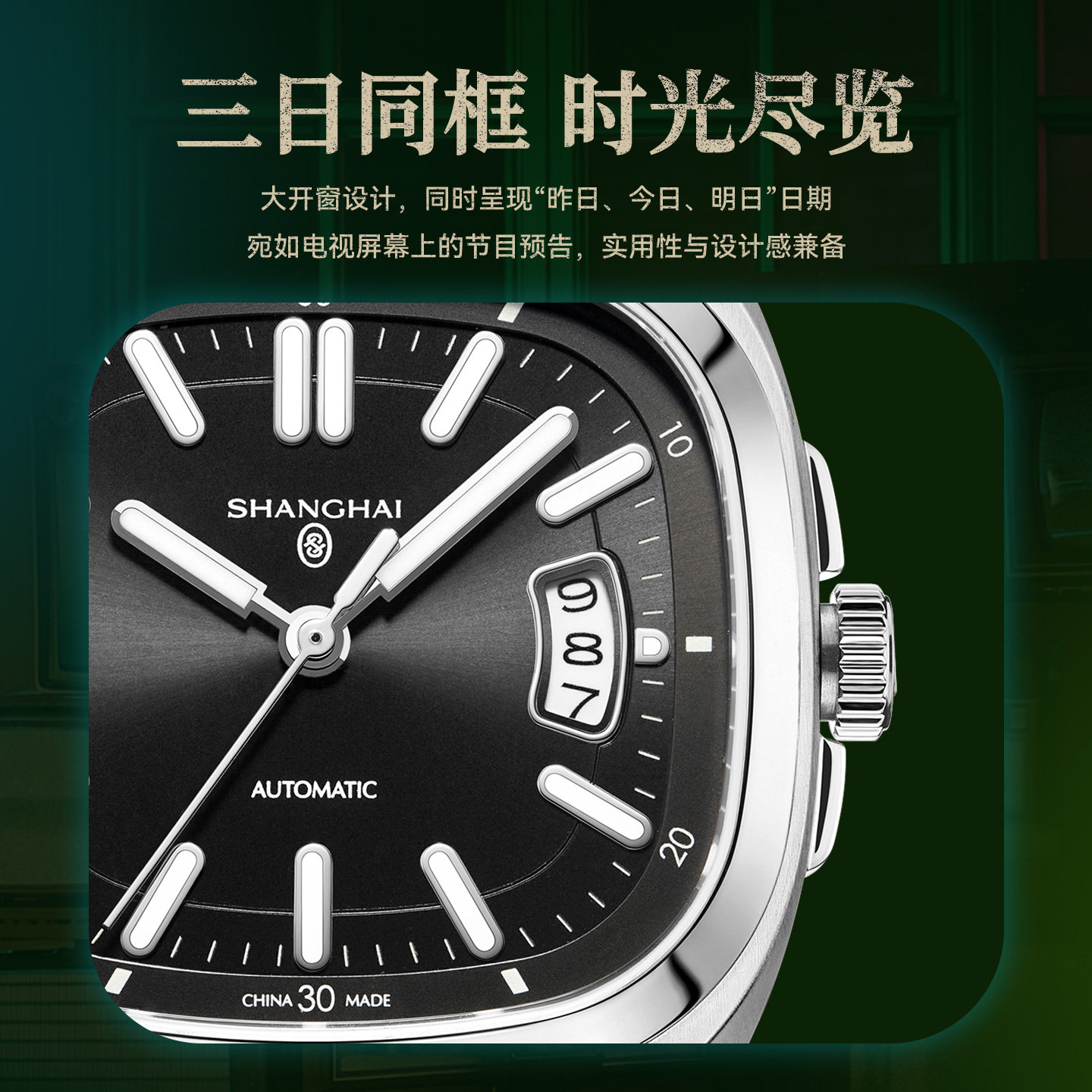 上海表百变小方系列魔方幻彩自动机械表日历三针夜光复古机械男表