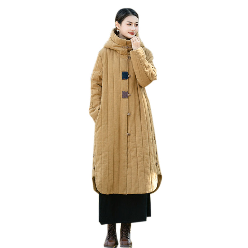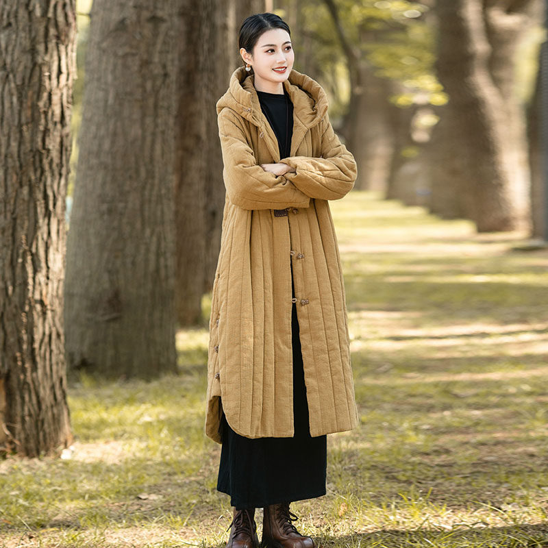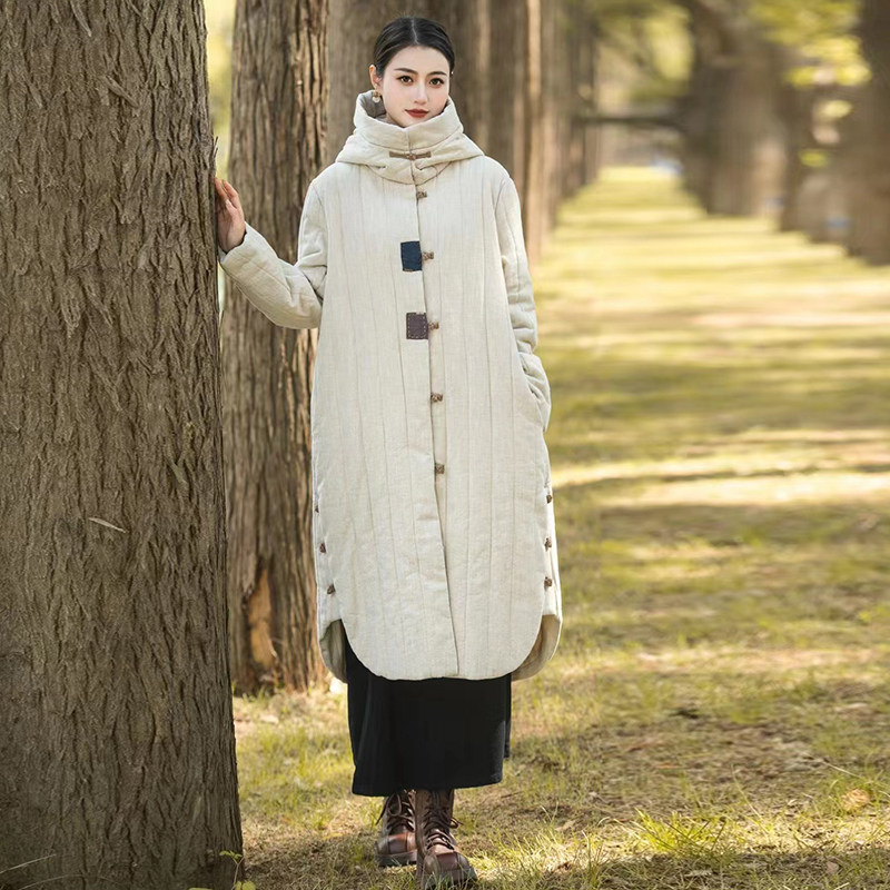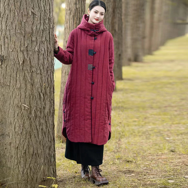 梅子家冬季连帽复古棉大衣棉麻贴布盘扣侧边圆角时尚洋气长款棉服