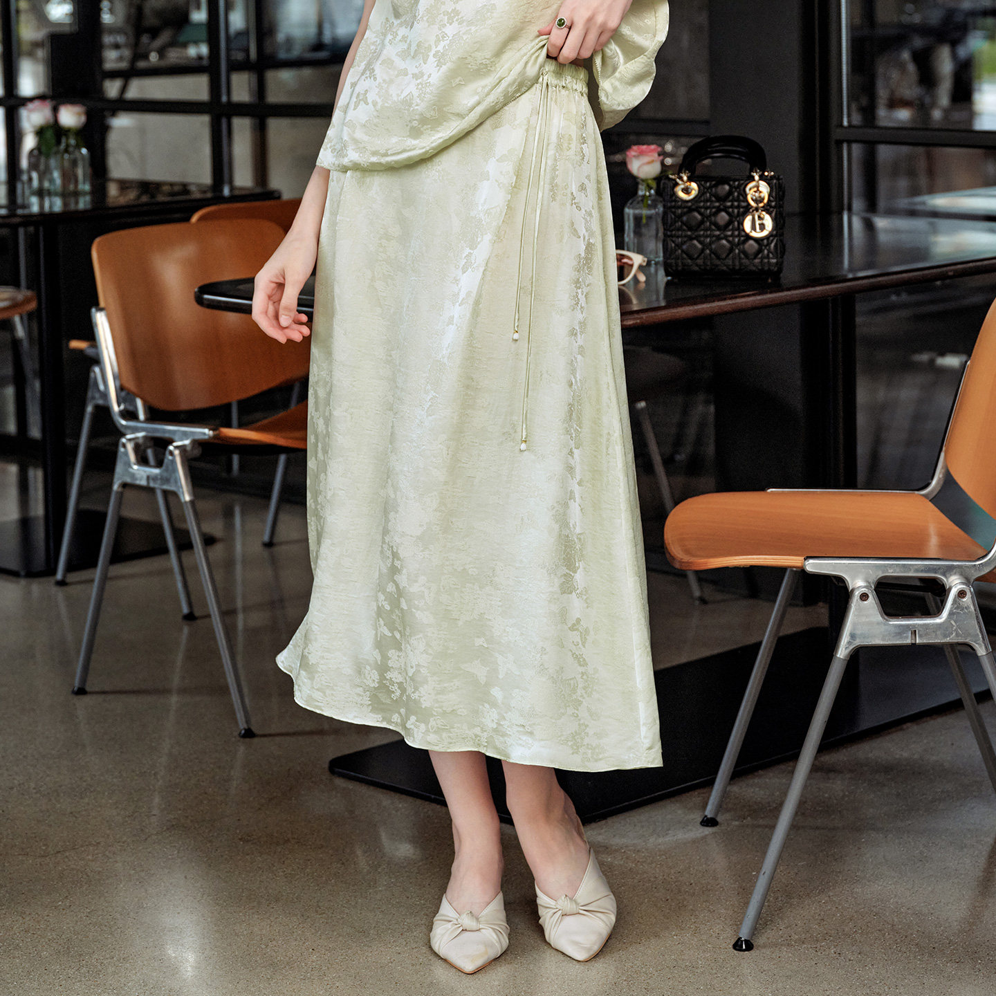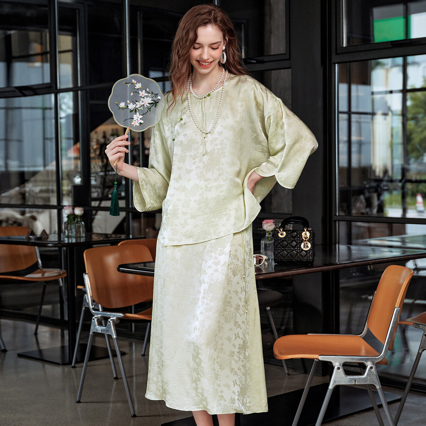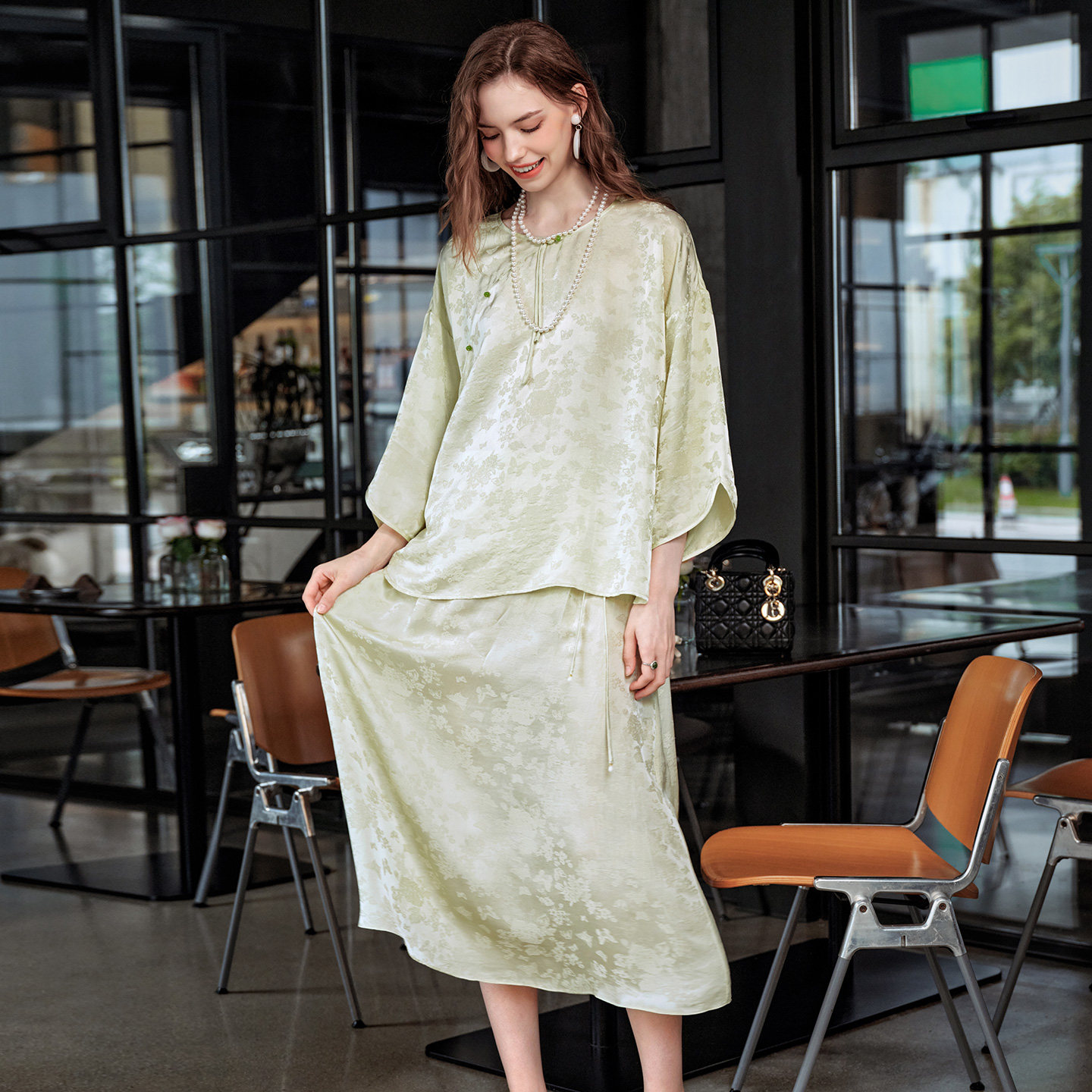 美标春夏新品中国风丝绸上衣女桑蚕丝提花半身裙可外穿睡衣家居服